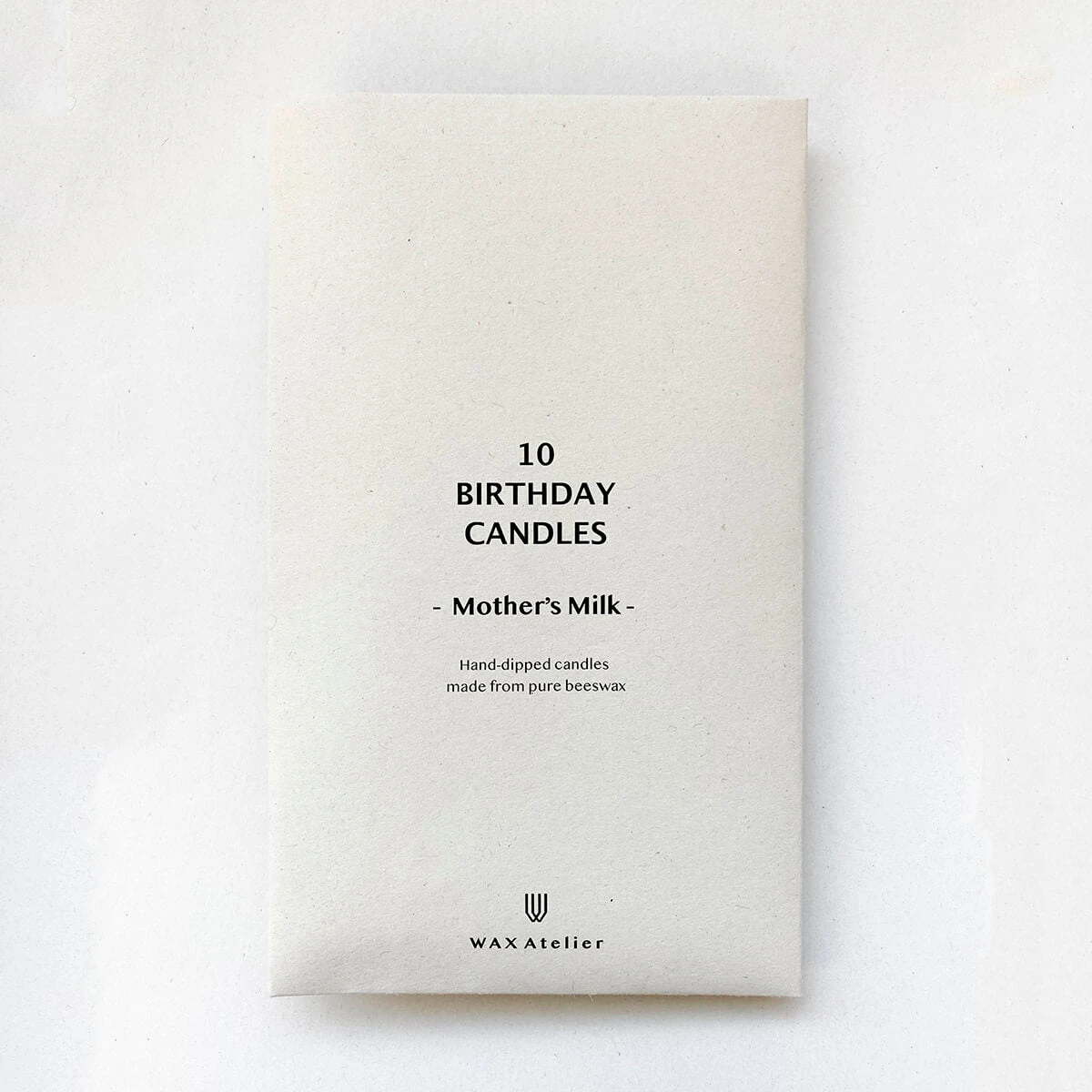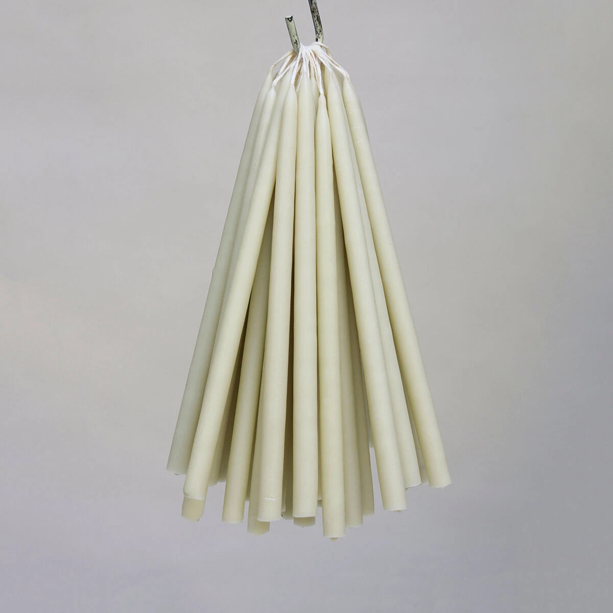 Set of ten birthday candles by Wax Atelier. A bundle of 10 long handmade candles made with white beeswax – a beautiful addition to a cake. Burn time: approx 45 minutes per candle.