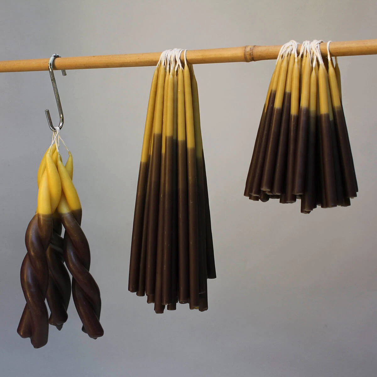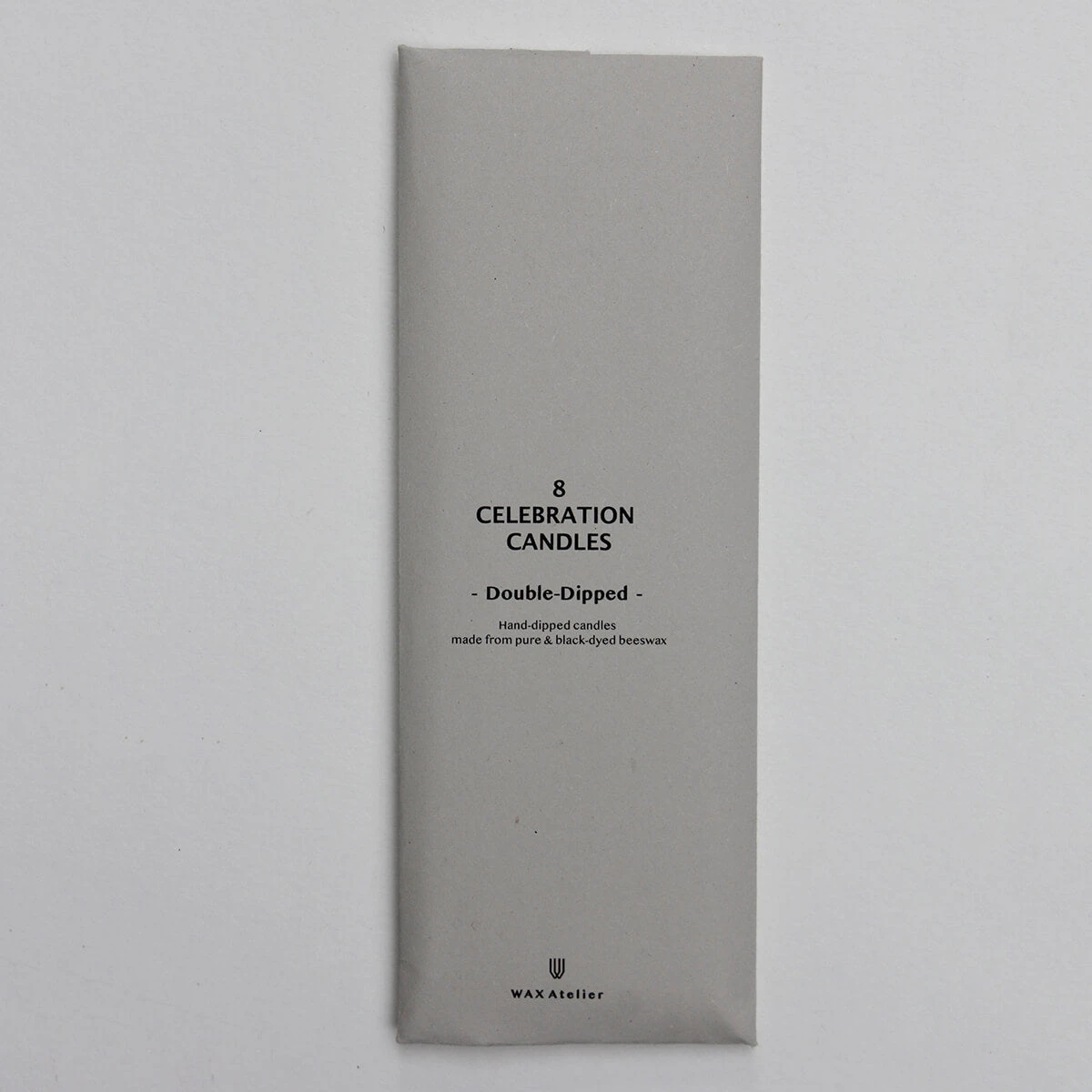 Set of eight Celebration extra long birthday candles by Wax Atelier. A bundle of 8 celebration candles. These candles are made purely with yellow beeswax with a final dip in dyed beeswax.  Burn time: approx 1.5 hrs per candle.