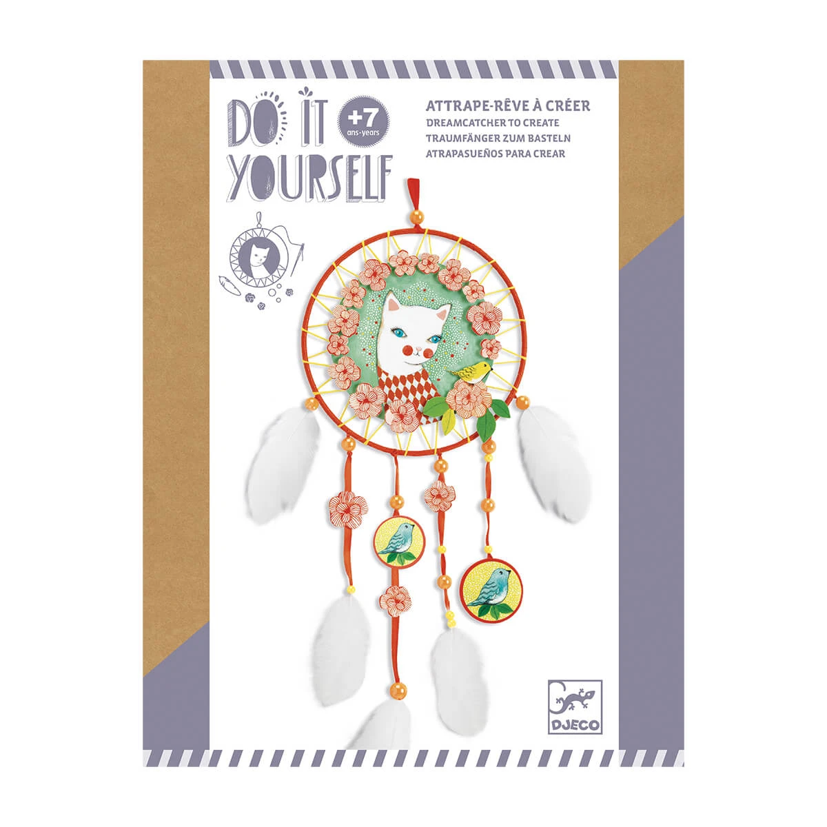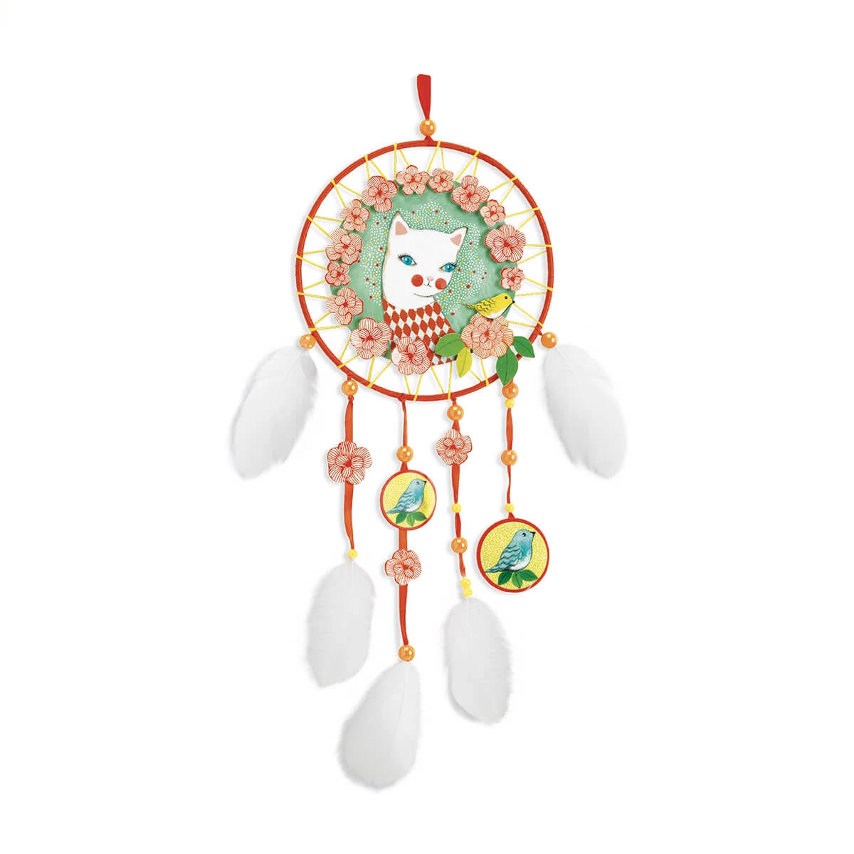 Arlecat dreamcatcher DIY craft kit by Djeco. Includes pre-cut cardboard elements, a ribbon-wrapped circle and an embroidery needle to make weaving easy, with various beads, threads, feathers and ribbon for decoration.