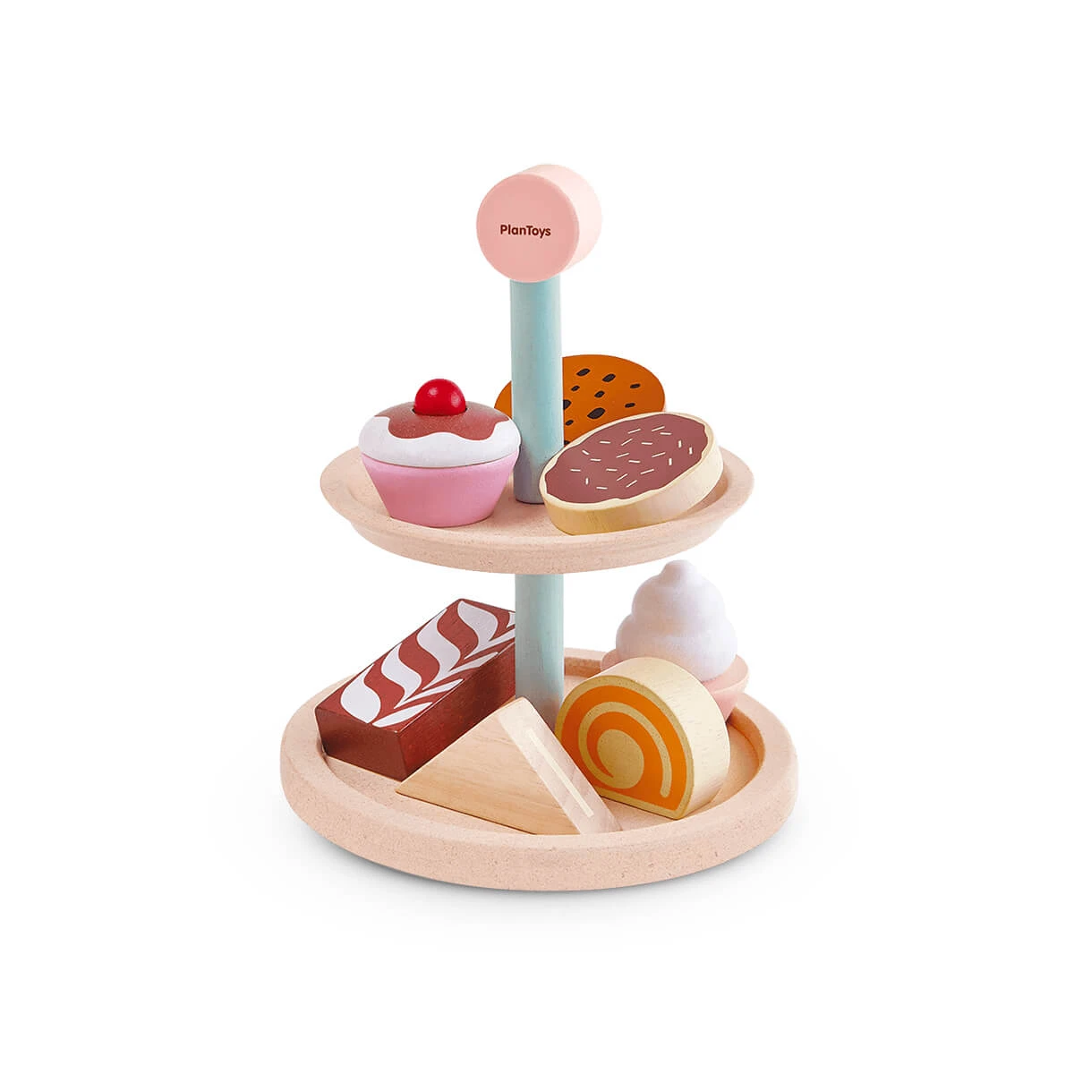 Bakery cake stand play set by PlanToys. This set consists of 1 two-tier cake stand, 1 sandwich, 1 slice of Swiss roll, 1 chocolate cake, 2 biscuits, and 2 cupcakes. Perfect for tea parties.