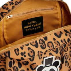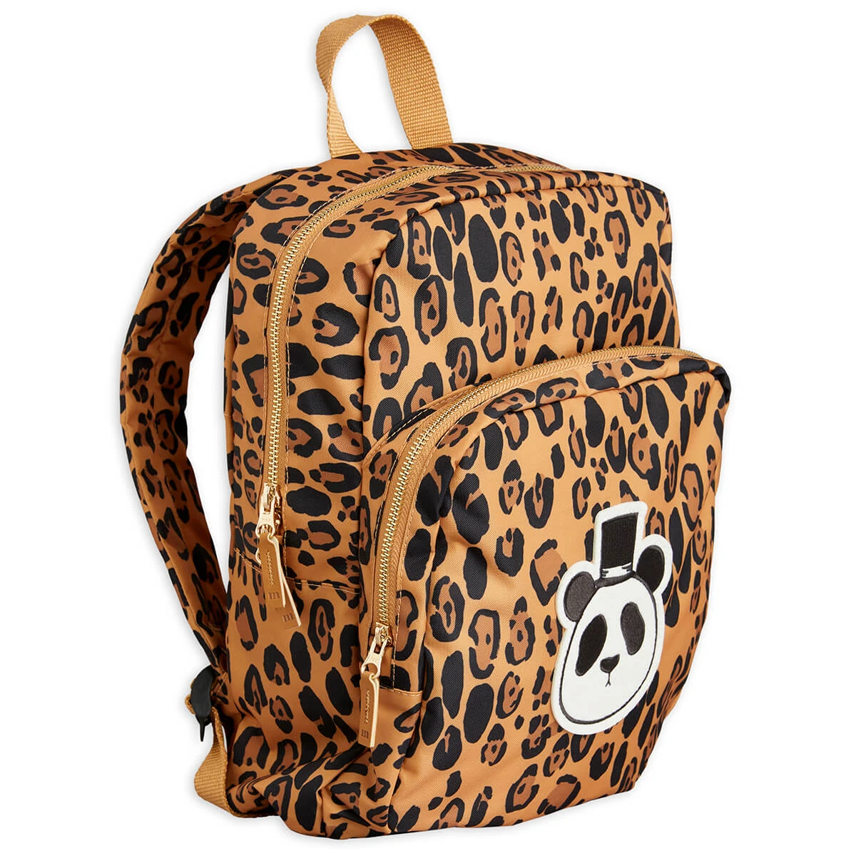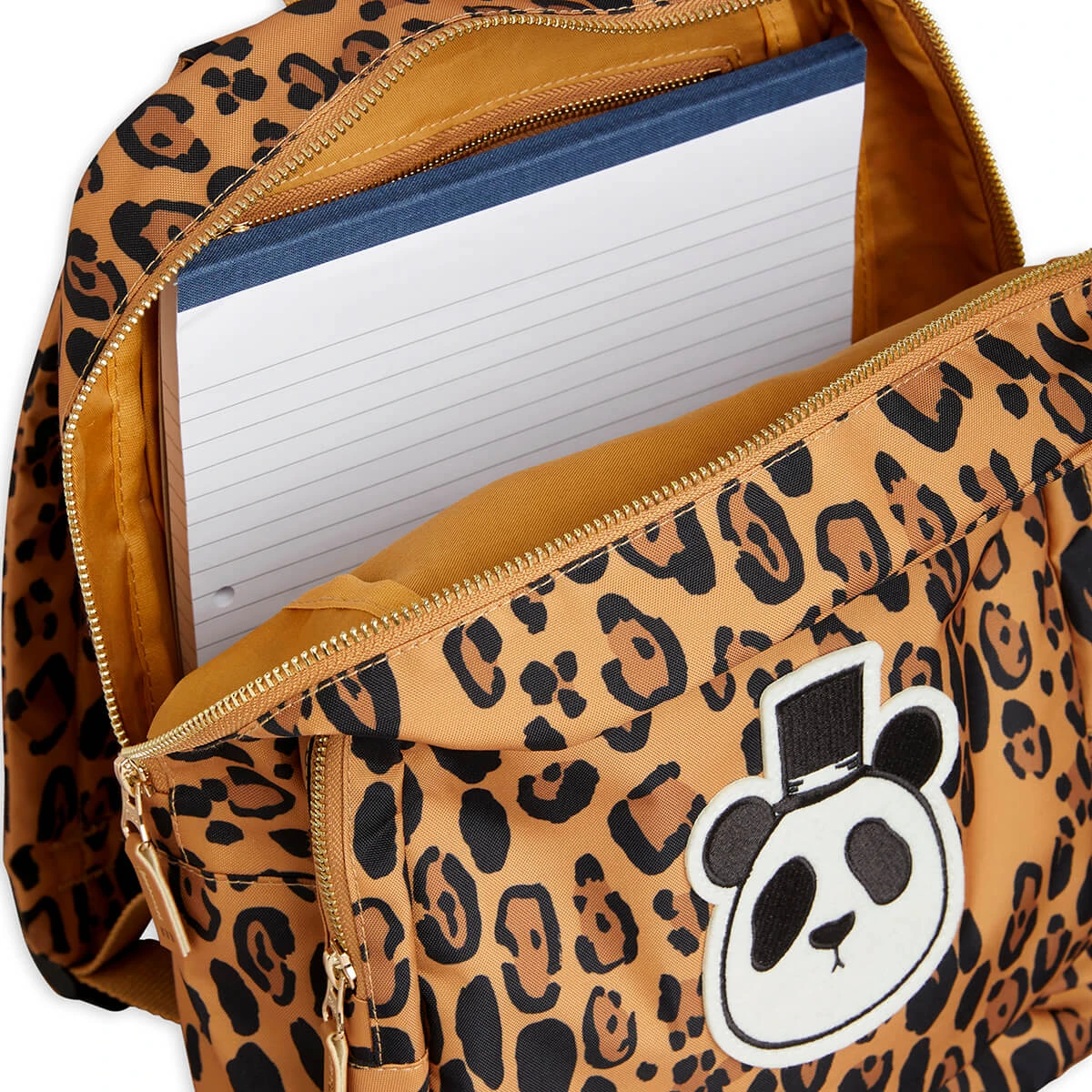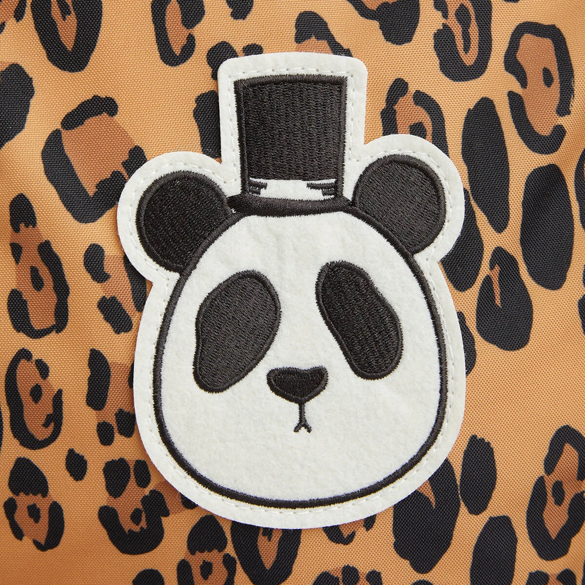 Panda backpack by Mini Rodini. Leopard print backpack with an embroidered Mini Rodini Panda patch decorating the front, made from 100% recycled polyester. The backpack features two zip pockets for all school essentials. Designed with adjustable padded shoulder straps.