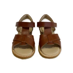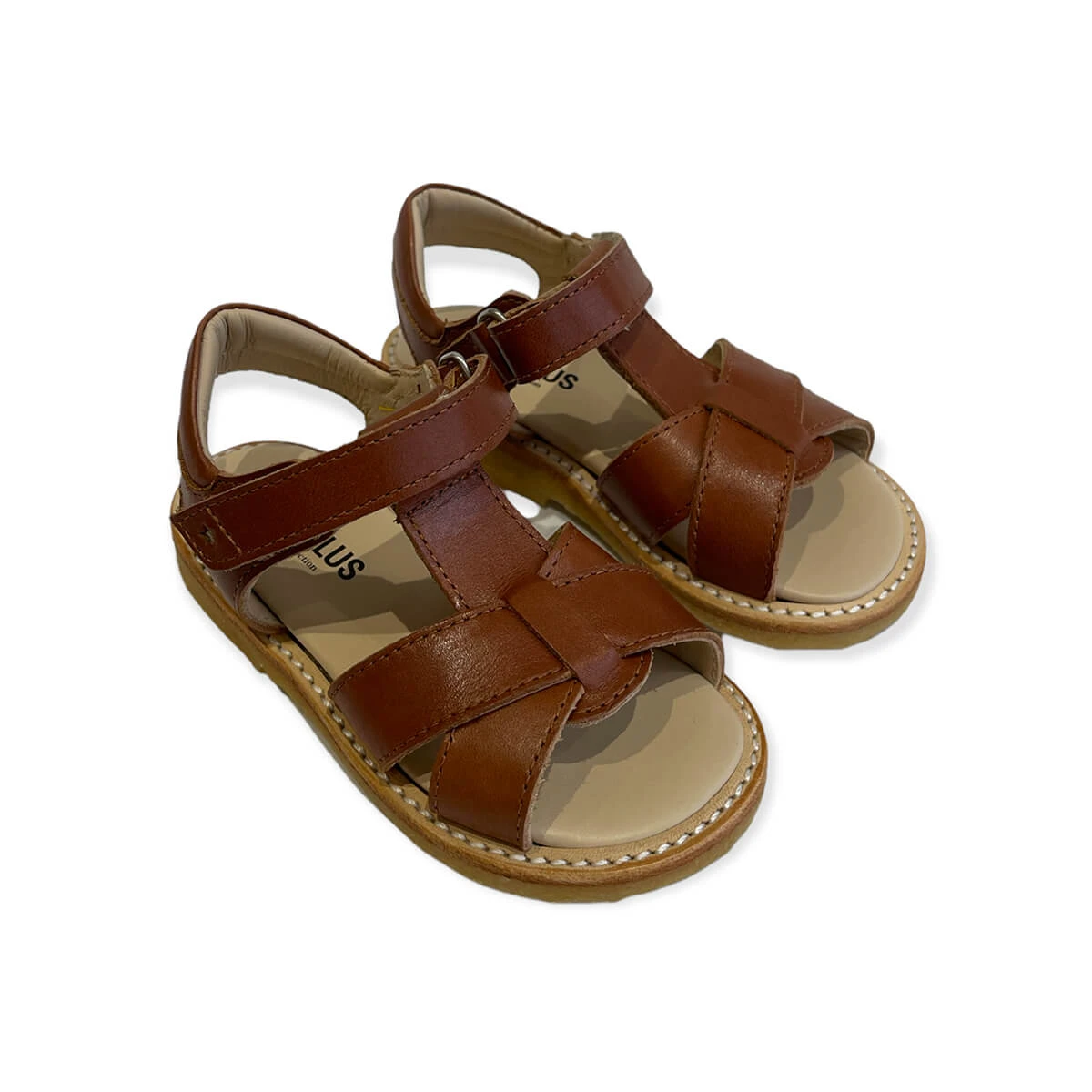 Leather sandals by Angulus. Basic sandal with an adjustable velcro strap. Open toe and open heel with wide crossover front. Soft and flexible crepe rubber sole. Lined with 100% chrome-free leather.