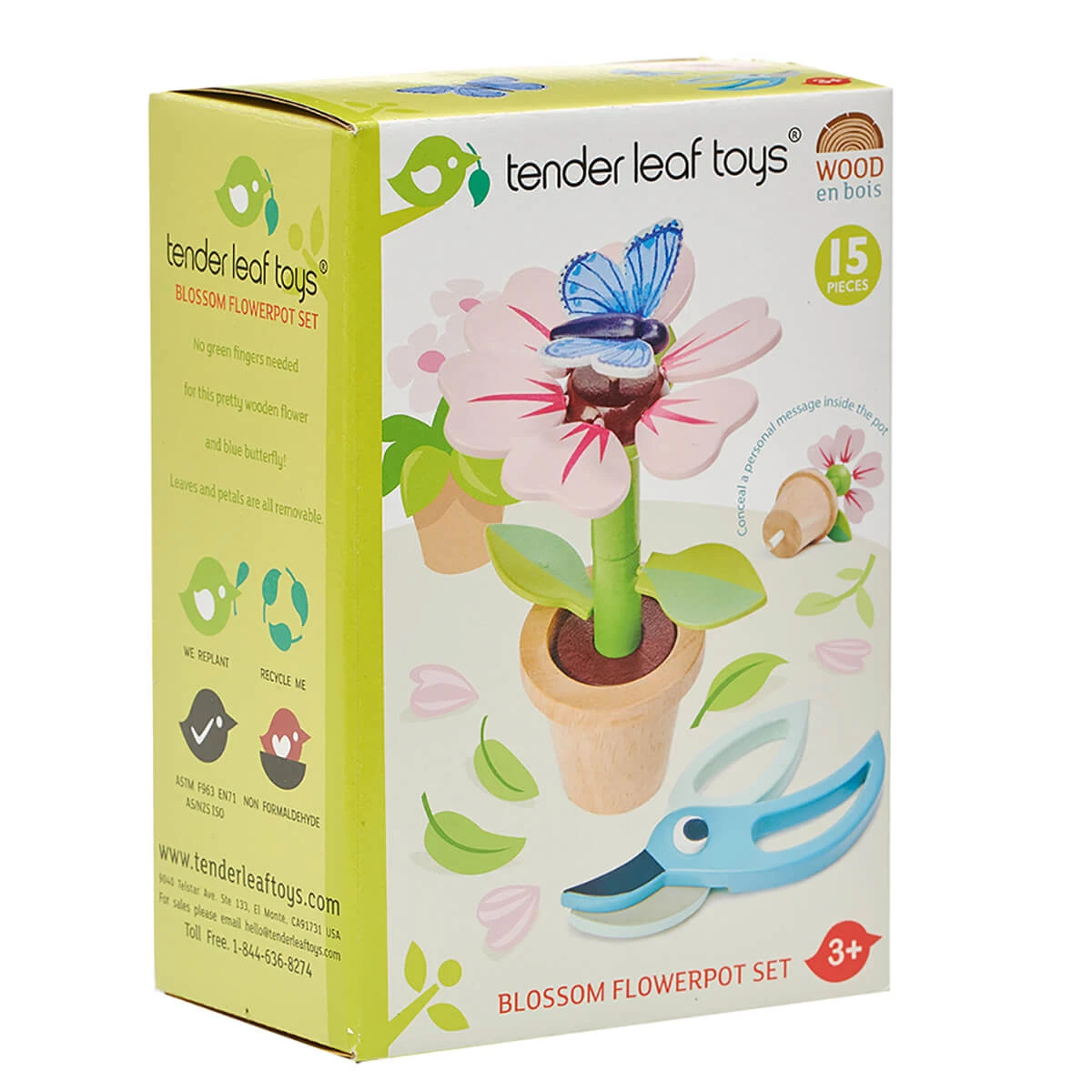 Blossom flower pot by Tender Leaf Toys. No green fingers needed for this pretty wooden flower and blue fluttering butterfly! Leaves and petals are removable, and you can even write a little message for a loved one and hide in the pot hole underneath!