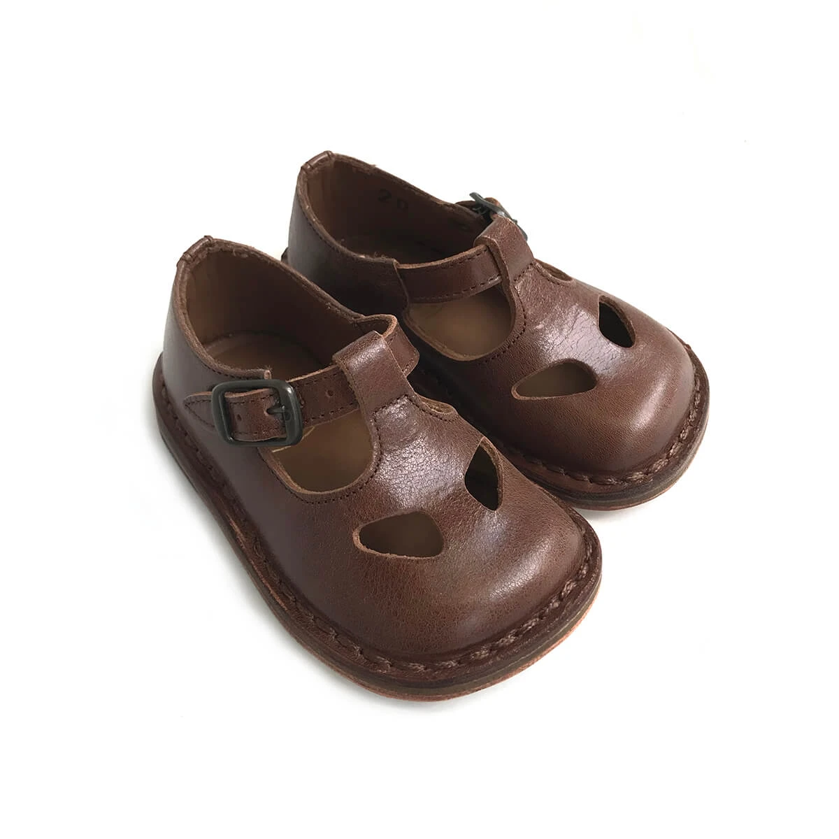 Bruno cut out sandals by PèPè shoes. Buckled T bar shoes in vegetally tanned brown leather with cut out details. Soft and flexible leather sole. Lined with 100% leather. Handmade using traditional methods in Italy.