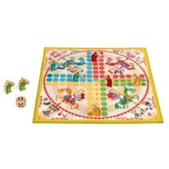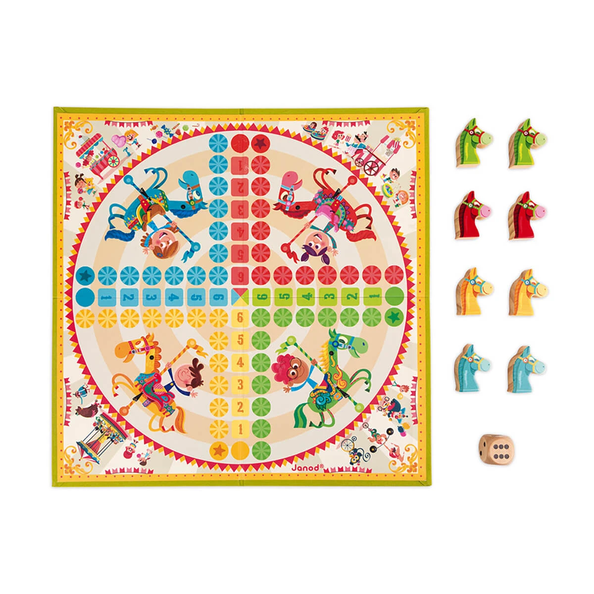 Carousel Ludo board game by Janod.  Board game for 2-4 players – be the first to lead your horse from your stable to the centre of the board. A classic family game of ludo for kids and adults reimagined around the theme of a fairground attraction with brightly coloured illustrations. It is an ideal game to stimulate their concentration and learn to count whilst having fun.  Includes a folding cardboard game board, 8 wooden horses and 1 wooden die in an attractive solid box for storing when not in play.  The rules of the game are in French, English, German, Spanish and Italian.