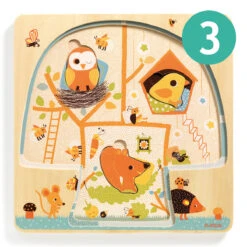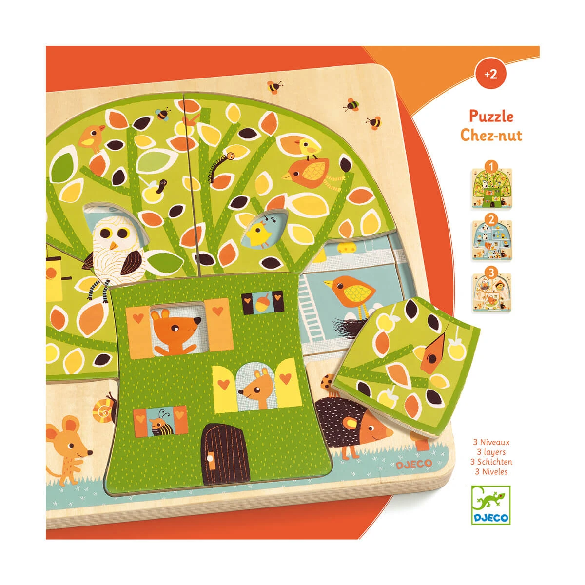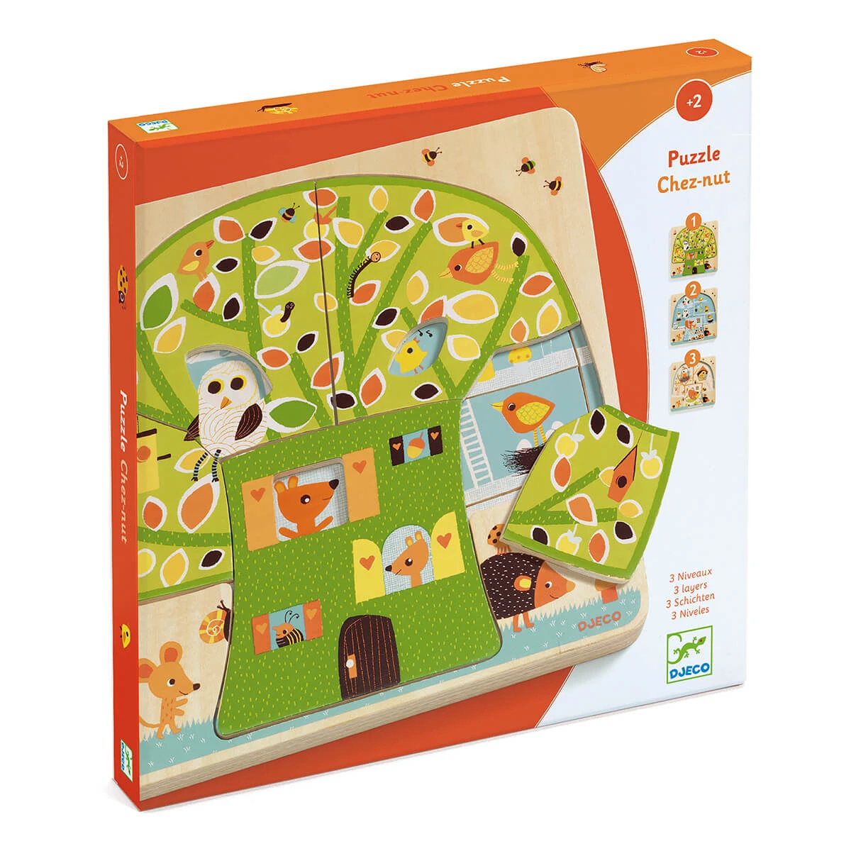 Chez Nut 3 layer wooden puzzle by Djeco. This puzzle has nine pieces and three layers. The first layer is the outside of the tree, the second layer are the rooms inside the treehouse and three little animals in their bed, an owl, squirrel and bird. Great for fine motor skills and shape recognition.