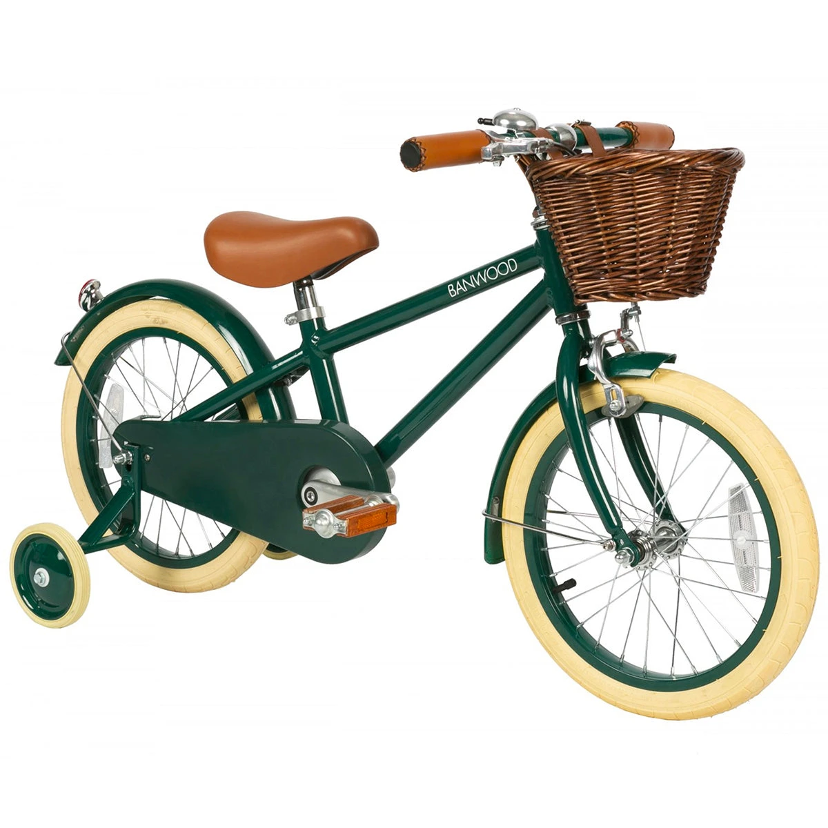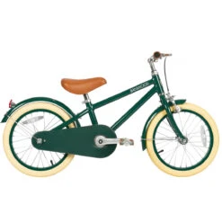Classic pedal bike by Banwood. Inspired by vintage bicycles for adults and influenced by Scandinavian design, the Banwood Classic features a lightweight alloy frame in green, finished off with a brown faux leather saddle and matching grips, Banwood’s unique rosewood vintage pedal, cream 16” tyres and a detachable wicker basket in rattan – perfect for packing in the essentials (think lunch, water bottle and favourite toy!) for a day’s adventure. The Banwood Classic includes all the premium bicycle trimmings – kick stand, training wheels, security wheel breaks, adjustable handlebar and saddle, bell, wheel reflectors, back reflectors and single speed gears.