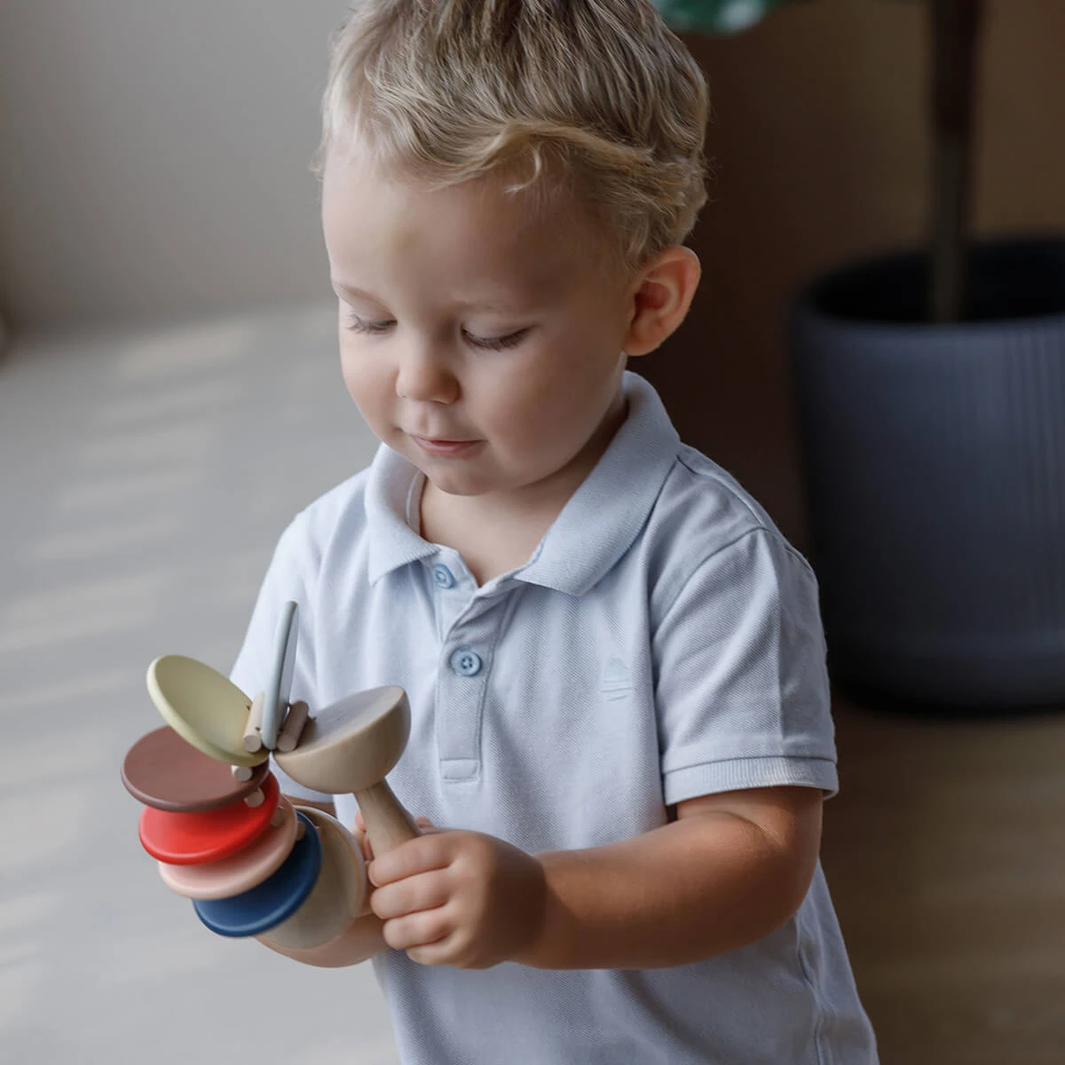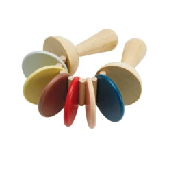Clatter toy in new Orchard Collection colours by PlanToys.  Creates a click-clack sound when moved.  Simple wooden musical instrument for babies and toddlers and a lovely introduction to rhythm and music making, as well as helping to develop coordination.