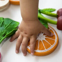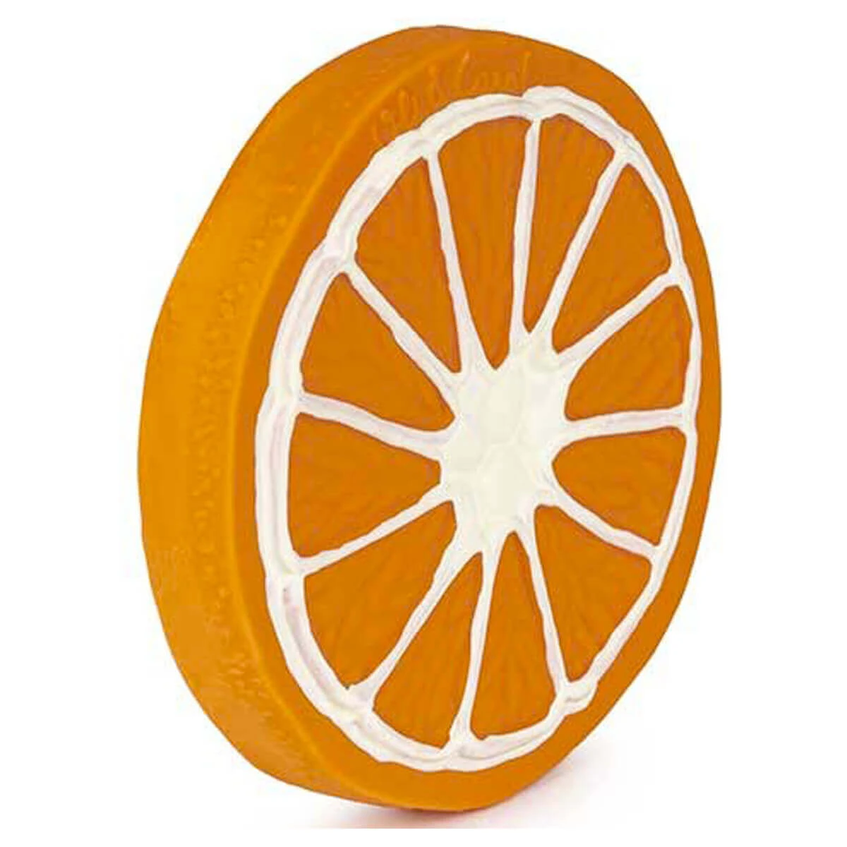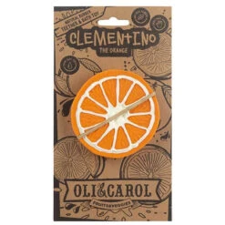 Clementino the Orange teether by Oli & Carol.  A chewable fruit shaped baby toy for sensory play, teething and bath time.  Crafted from 100% natural latex taken from Hevea Malaysian trees and hand painted with safe, natural food graded dyes.  Anti-bacterial and highly hygienic, with no holes or seams which means no bacteria or mould is present.  Can be used as a teether, bath toy, decorative object and more.  Soft, easy to grasp and safe to chew.  Stimulates baby’s senses and soothes teething gums.
