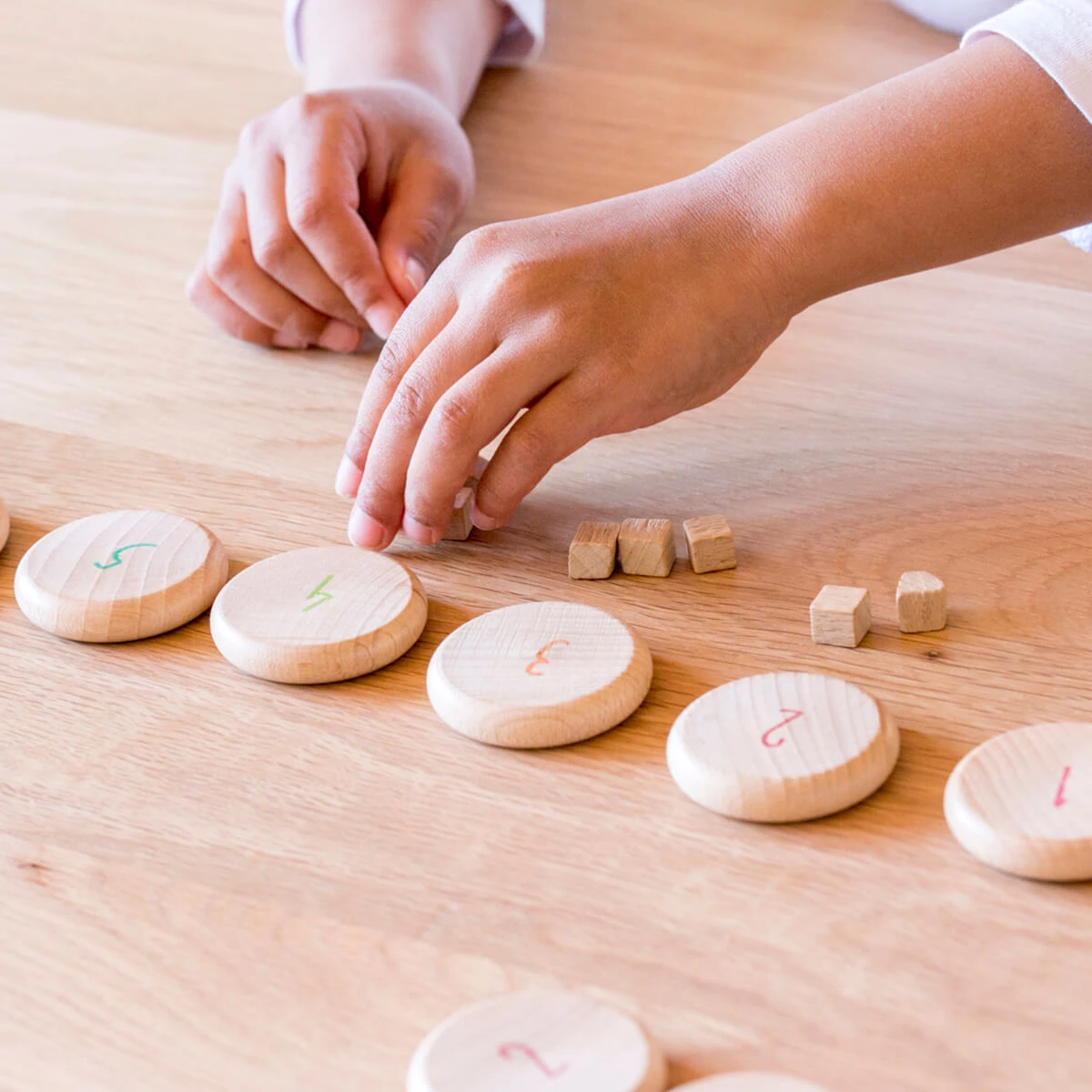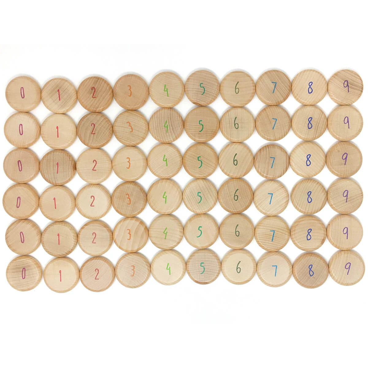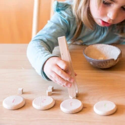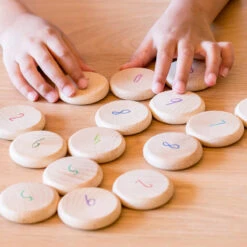 60 counting coins in natural wood by Grapat. Round in shape with slightly curved edges that are pleasant to the touch and allow children to learn while playing. Play to exchange as play money, collect, sort and order, add and subtract. In addition, the coins can be used for various constructions and creations of mini worlds and as the perfect material for mathematical logic.