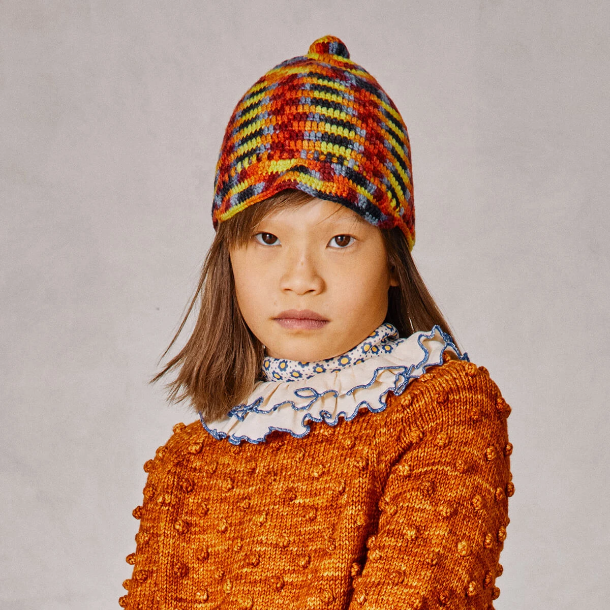 Crochet cap by Misha & Puff. A hand-crocheted hat in hand-dyed merino wool with a popcorn drawstring cord. Features a small visor to keep the sun out of your little one’s eyes. So versatile – style it in all sorts of ways for all sorts of looks!