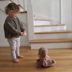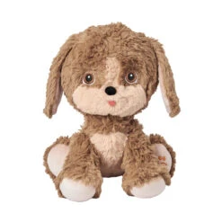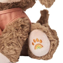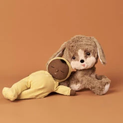 Dinkum Dogs Honey doll by Olli Ella. Honey needs lots of love to keep that tail wagging and plenty of Dinkum Doll Walks! Made from soft plush fabric that is 100% recycled with velvety ears to nuzzle, Honey is fully poseable and can stand, lay down and even sit! Honey’s head moves and is embroidered with the sweetest doggy face, plus there’s a rainbow surprise on one of Honey’s little paws! This little pup loves to carry a bone about, and this is made easy with a specially designed magnetized mouth and matching magnetic bone accessory!