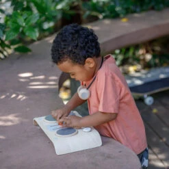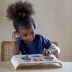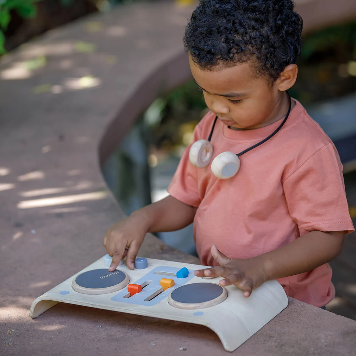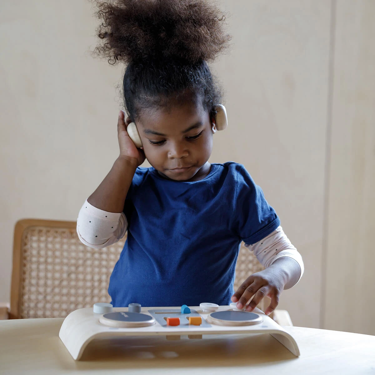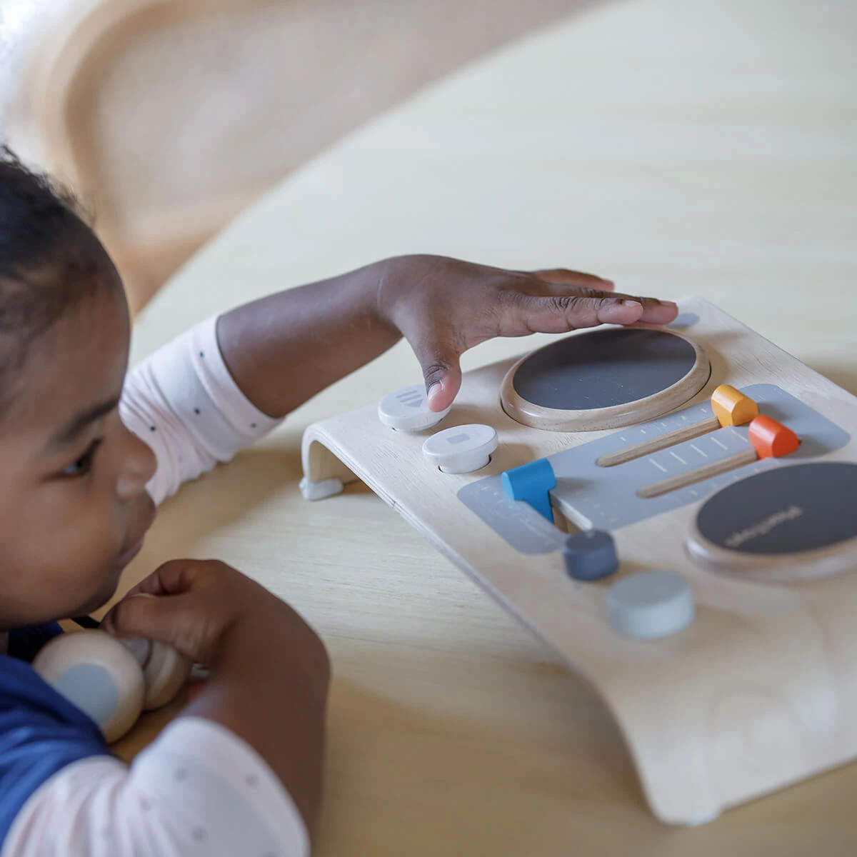 DJ Mixer Board by PlanToys. Become a professional DJ with the DJ Mixer Board! This toy not only supports fine motor skill development through role play, but also invites children to practice their colour recognition and implement creative thinking. Rotate the disc like a real DJ, slide the volume bar up and down, and press the buttons to create unique mixes of your own!