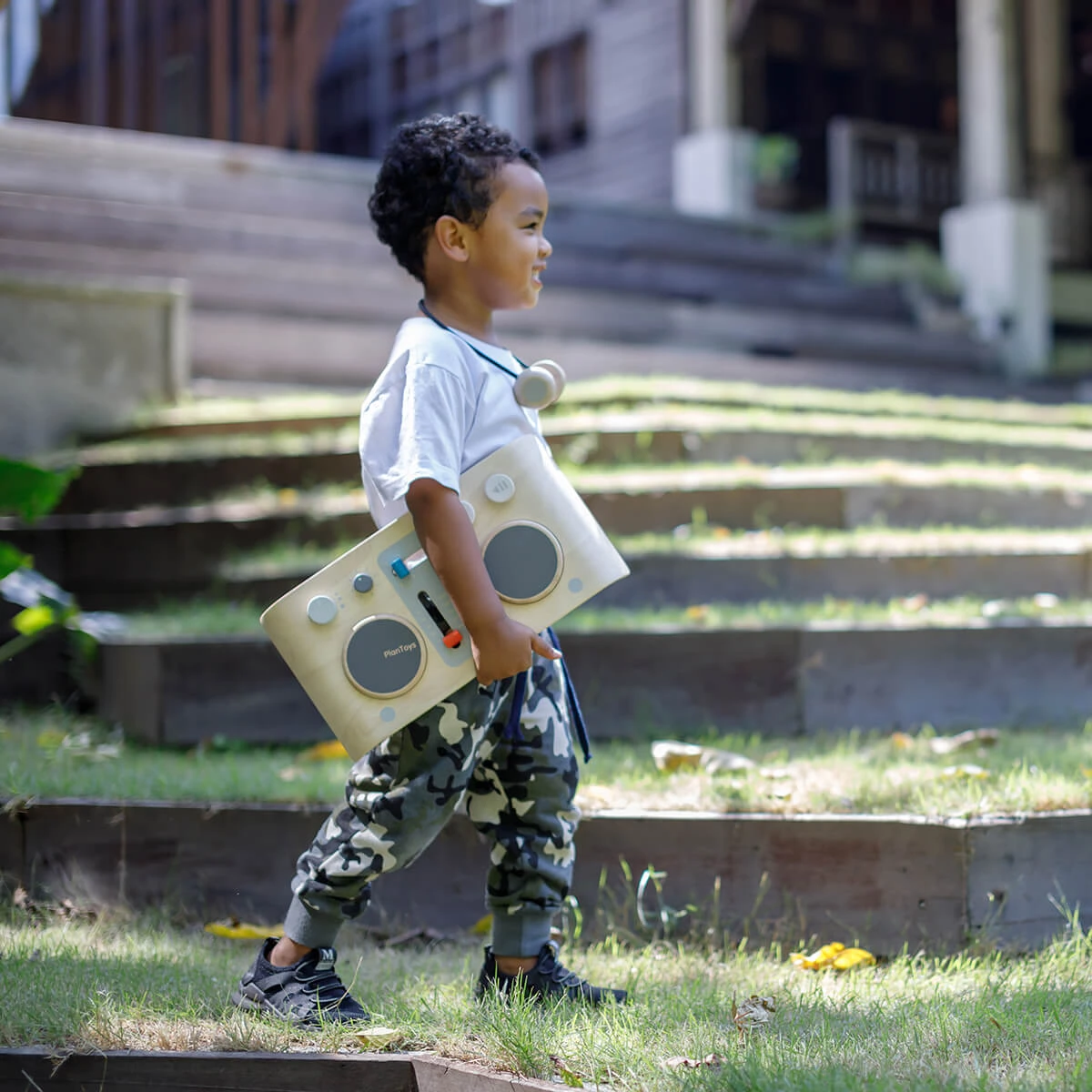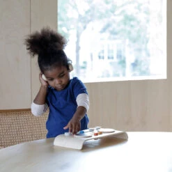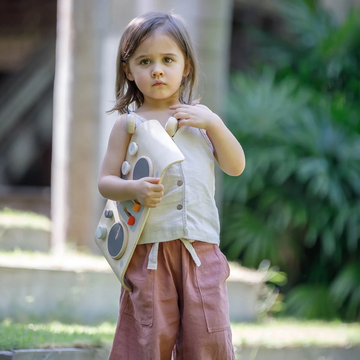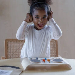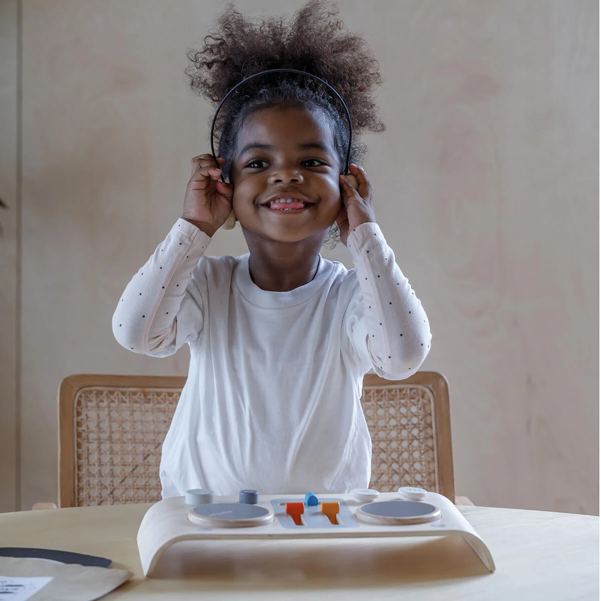 DJ Mixer Board by PlanToys. Become a professional DJ with the DJ Mixer Board! This toy not only supports fine motor skill development through role play, but also invites children to practice their colour recognition and implement creative thinking. Rotate the disc like a real DJ, slide the volume bar up and down, and press the buttons to create unique mixes of your own!