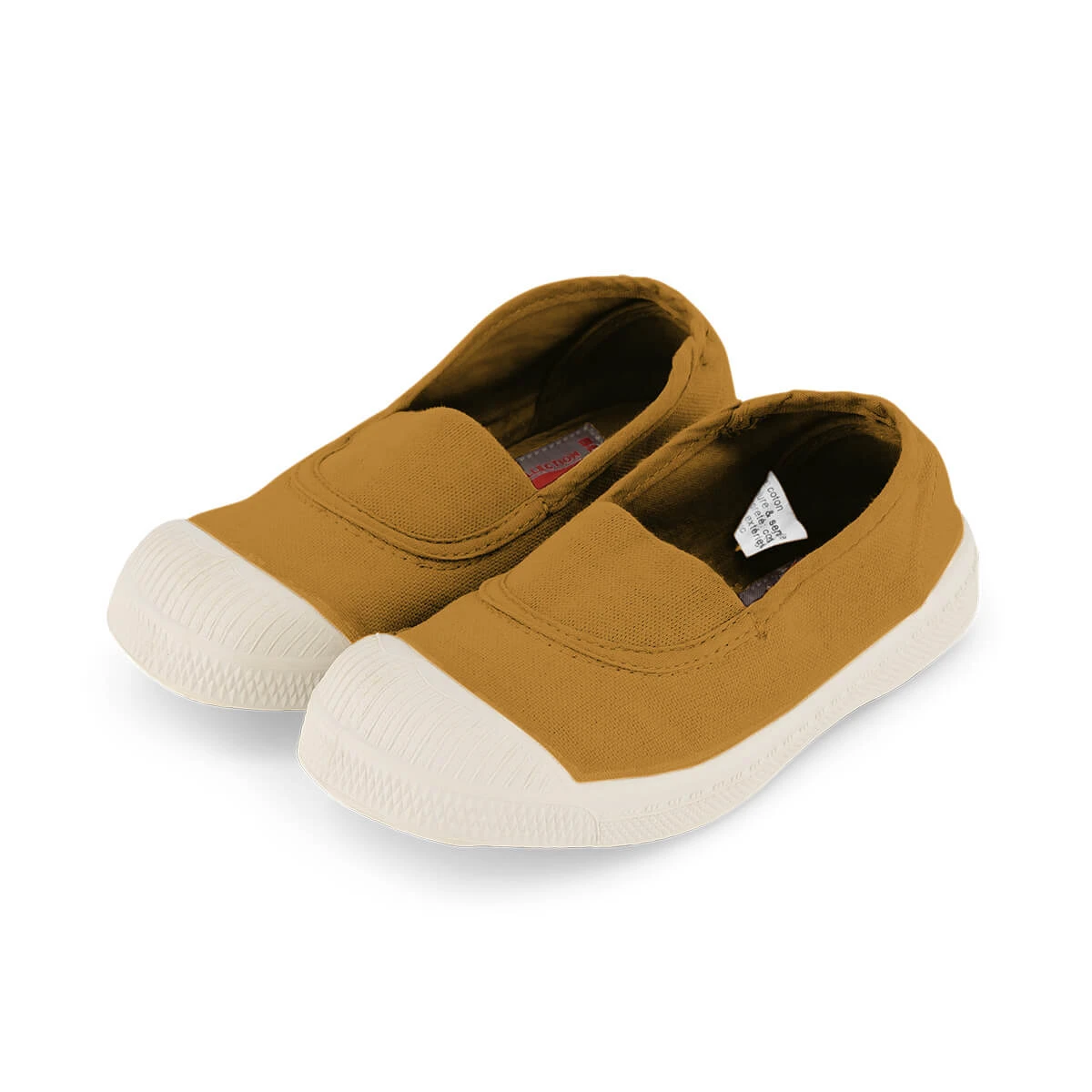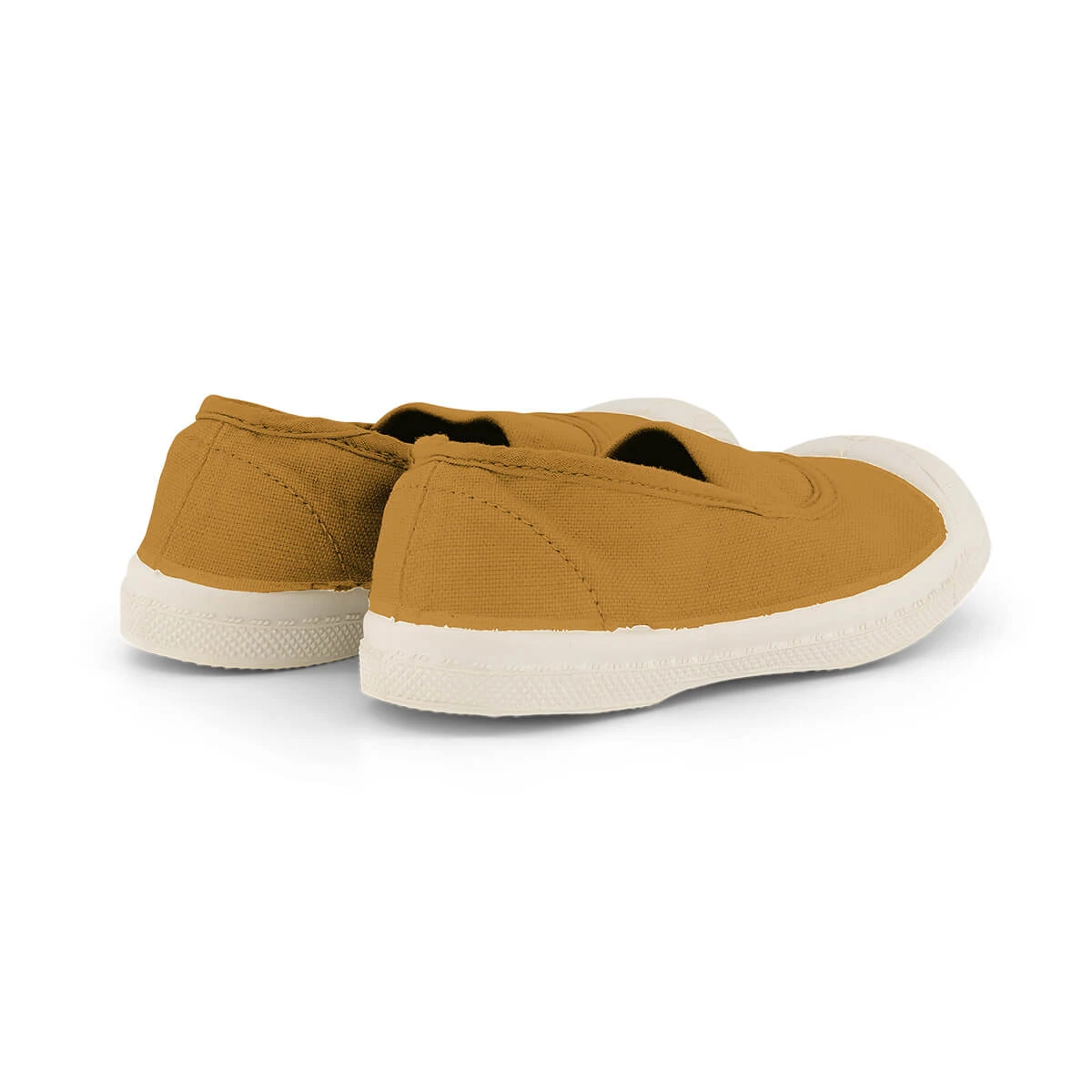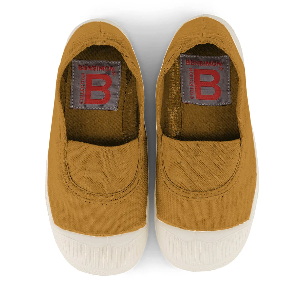 Elastic tennis shoe by Bensimon. Simple slip-on elasticated front version of the Bensimon tennis shoe. This slip-on style is easy to put on and quick to take off. Thin and lightweight made from rubber and natural cotton. Every shoe is hand-dyed in Bensimon’s workshops in France, meaning every pair has its own variations and is completely unique.