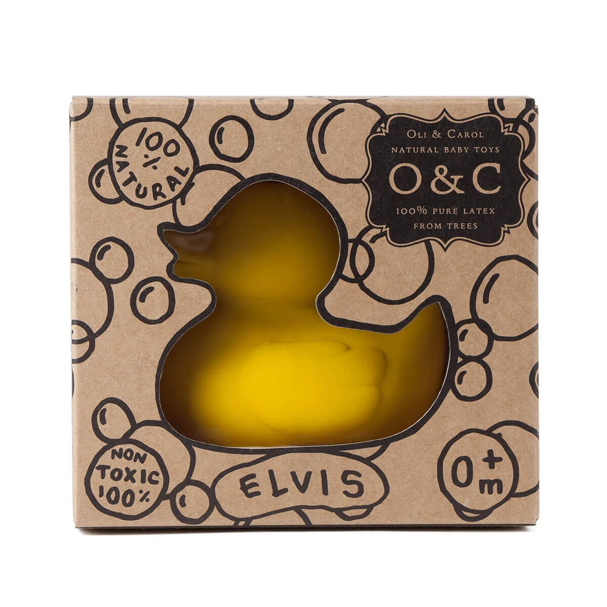 Classic iconic rubber duck by Oli & Carol.  Elvis the duck is hand crafted from 100% natural latex taken from Hevea Malaysian trees and hand painted with safe, natural food graded dyes.  Anti-bacterial and highly hygienic, with no holes or seams which means no bacteria or mould is present.  Can be used as a teether, bath toy, decorative object and more.  Soft, easy to grasp and safe to chew.  Stimulates baby’s senses and soothes teething gums. Â