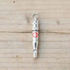 Emergency ID whistle by Hightide Penco. A small, easy to carry emergency whistle with key chain. It is particularly useful for vulnerable people such as the elderly, children or people in care. It features a water proof capsule containing your personal information, which can be opened in case of emergency.