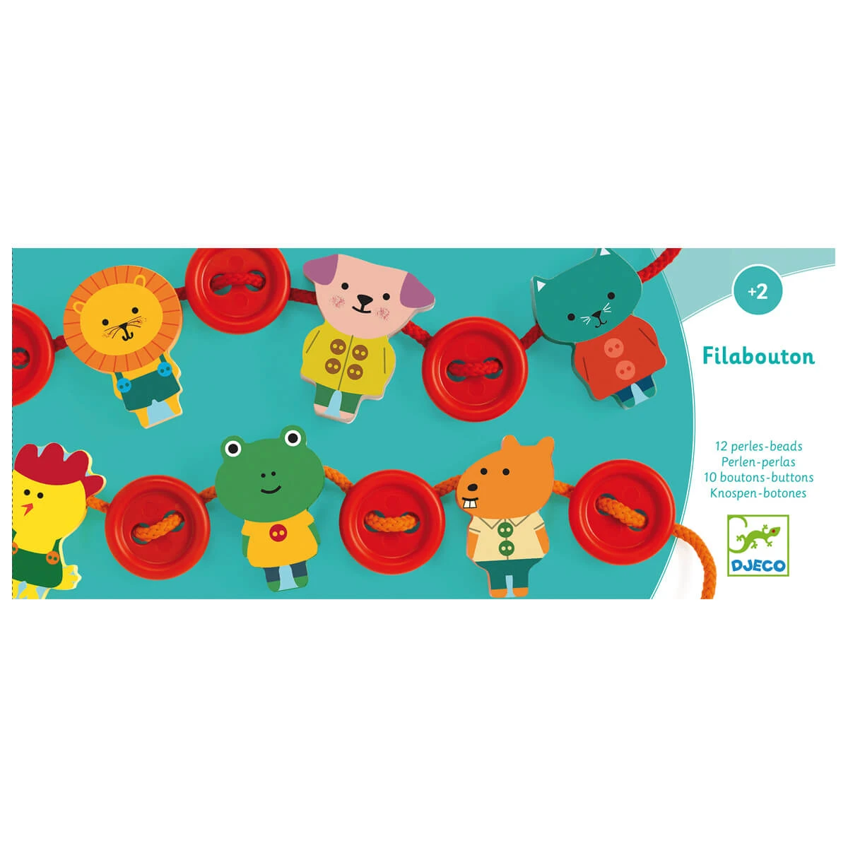 Filabouton threading beads by Djeco. Beautiful set of that comes with 12 animal figures and 10 buttons, with 2 lacing threads. Great from little ones fine motor skills.