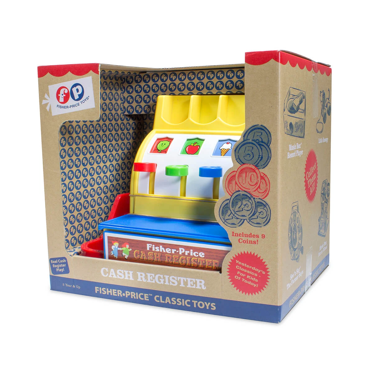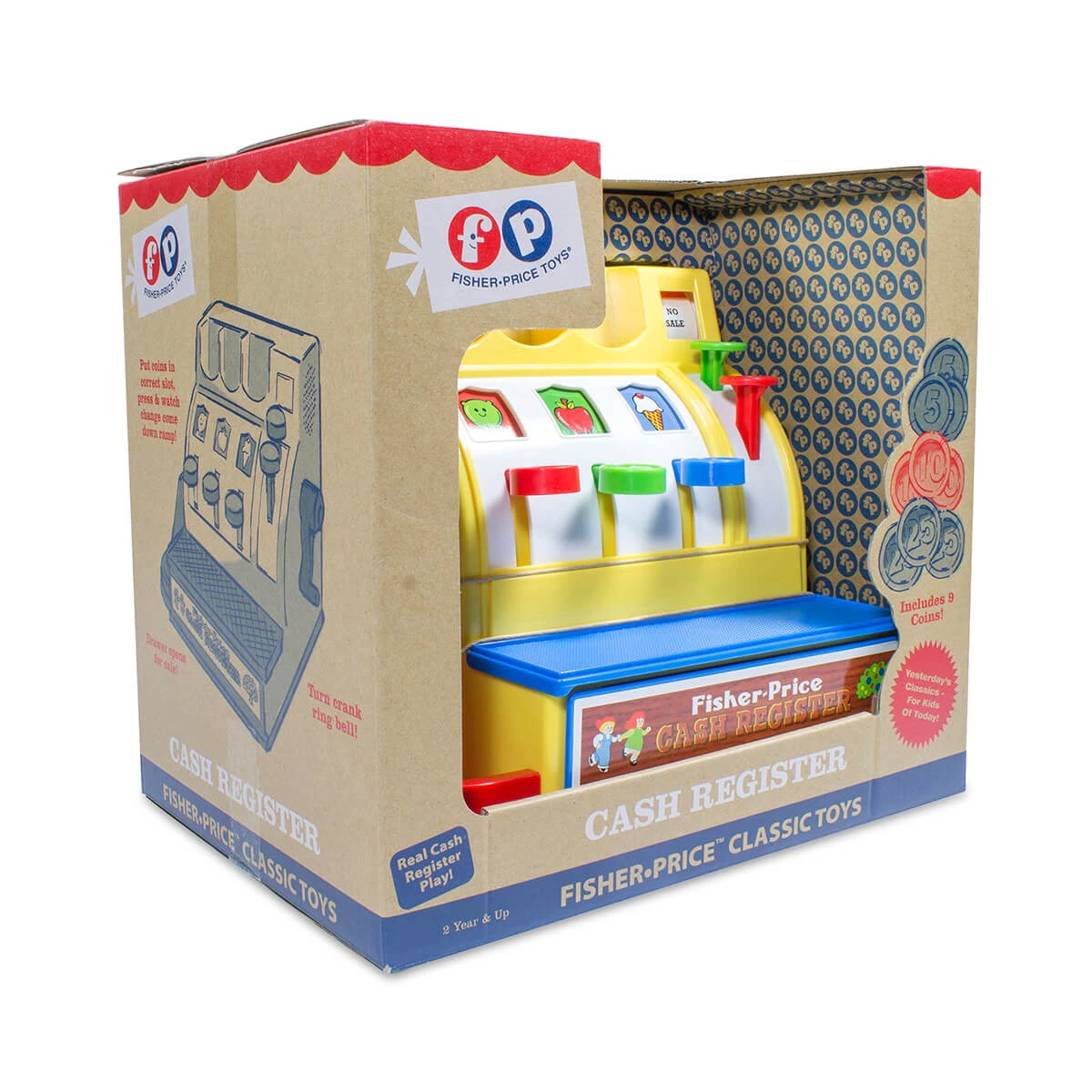 Classic Cash Register by Fisher Price. Authentic reproduction of the original Fisher Price toy from 1975. Real cash register play including 6 brightly coloured coins that will teach children how to count and recognise colours. Watch the coins come down the ramp, turn the crank to hear the bell ring and watch the drawer open. Hours of fun.