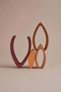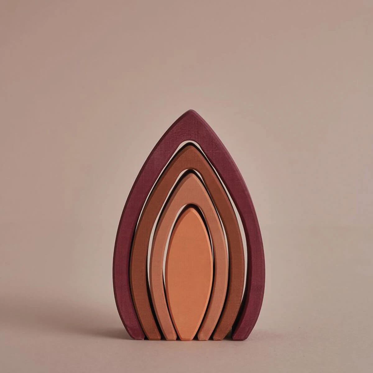 Flame arch stacker by Raduga Grëz. 4 piece stacking flame arch made from solid lime wood and dyed with non-toxic watercolours. Great for creative and imaginative play and with endless possibilities. Comes with a cotton drawstring bag for storage.