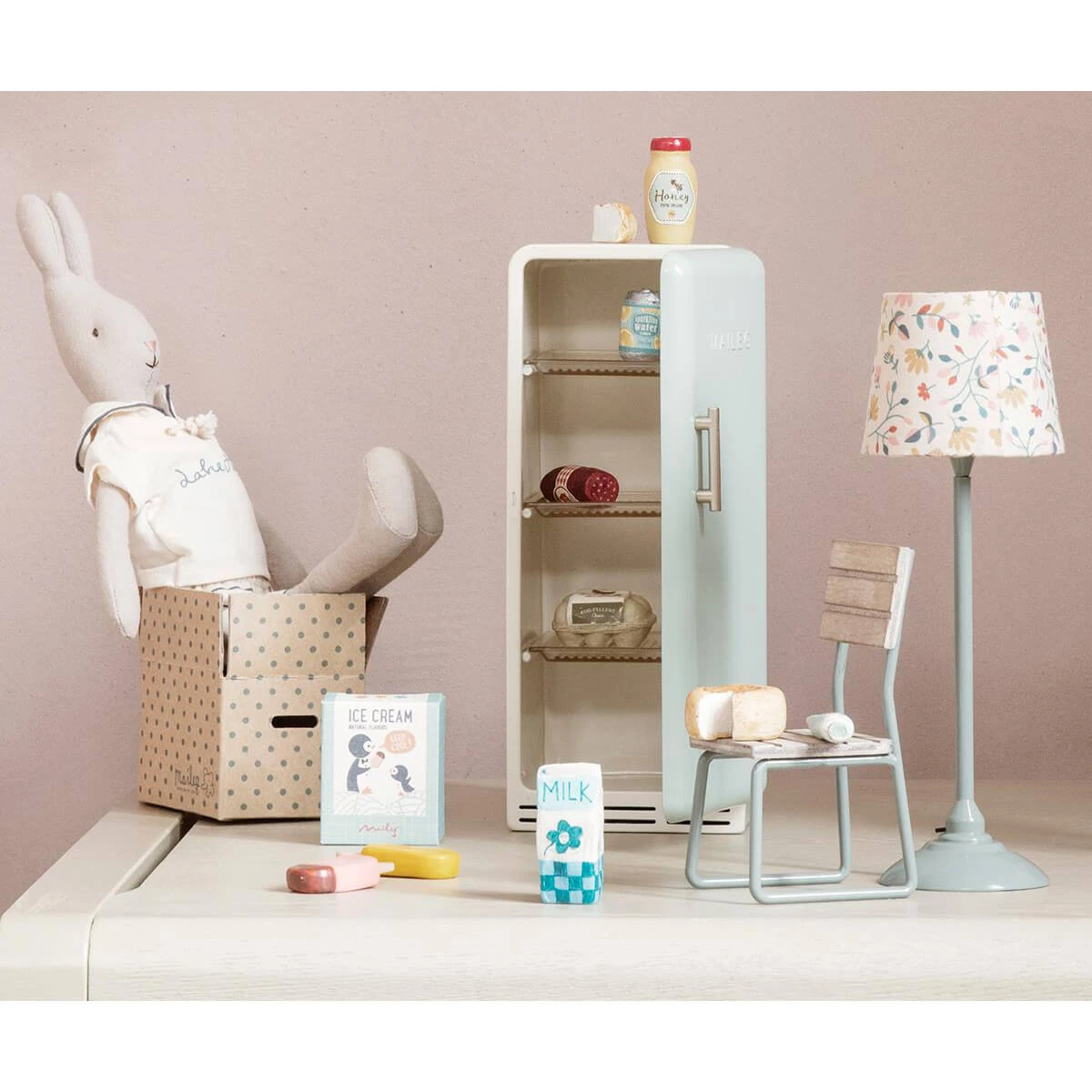 Food grocery box by Maileg. This selection of food includes mayo, milk, honey jar, sausage, 4 ice cream sticks, egg carton, 2 soda cans and a cheese. All the food you need, delivered in a cardboard box.
