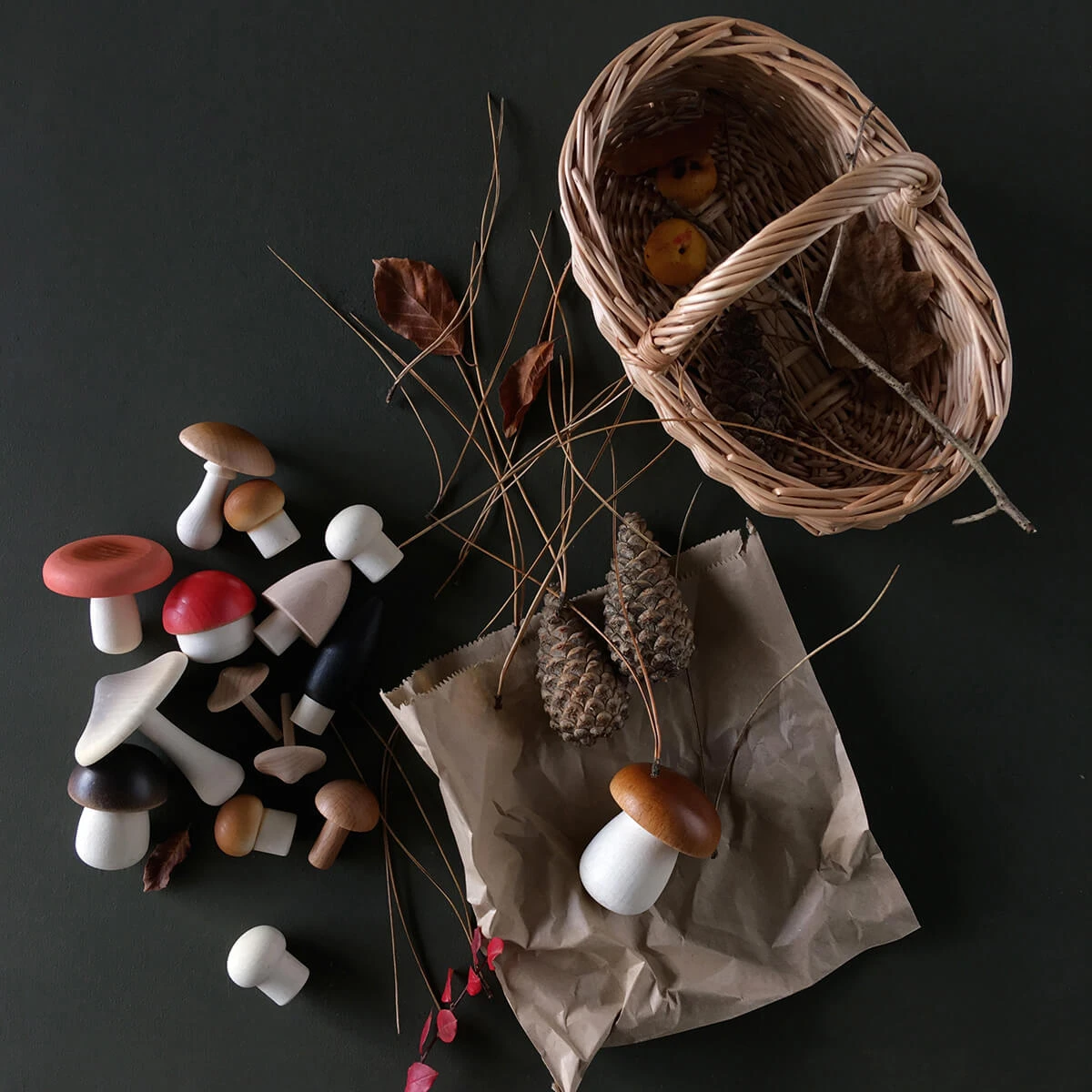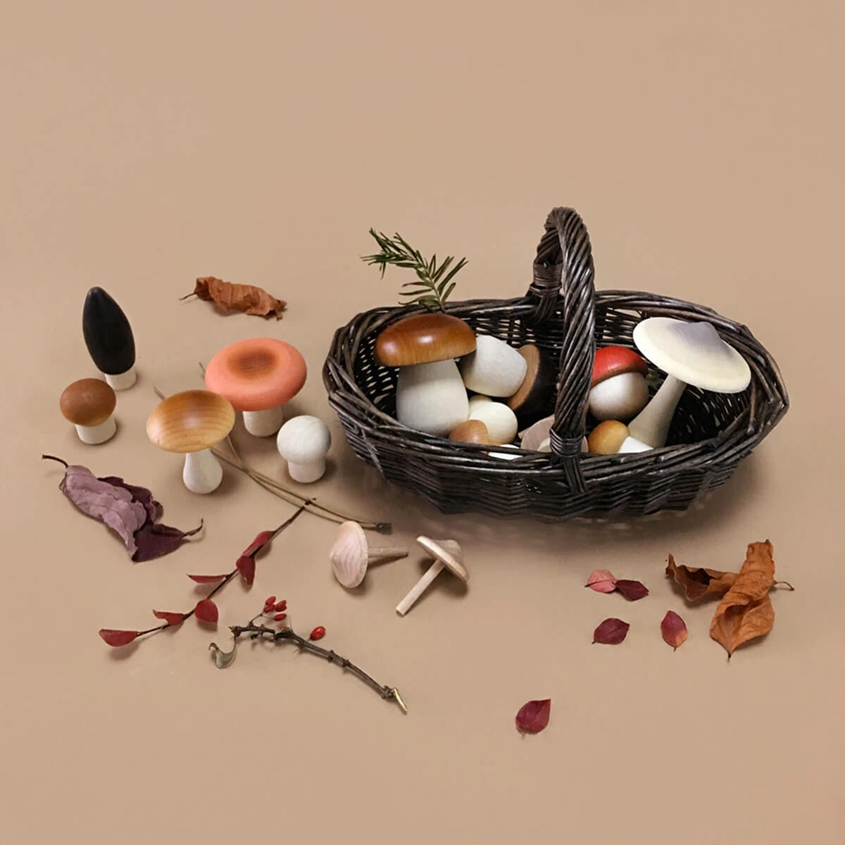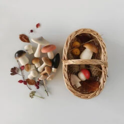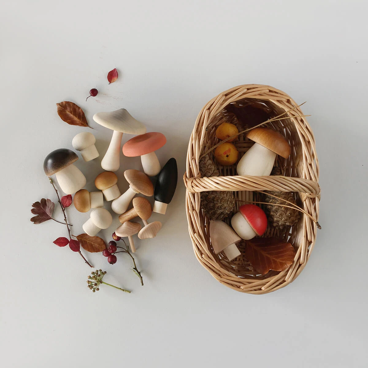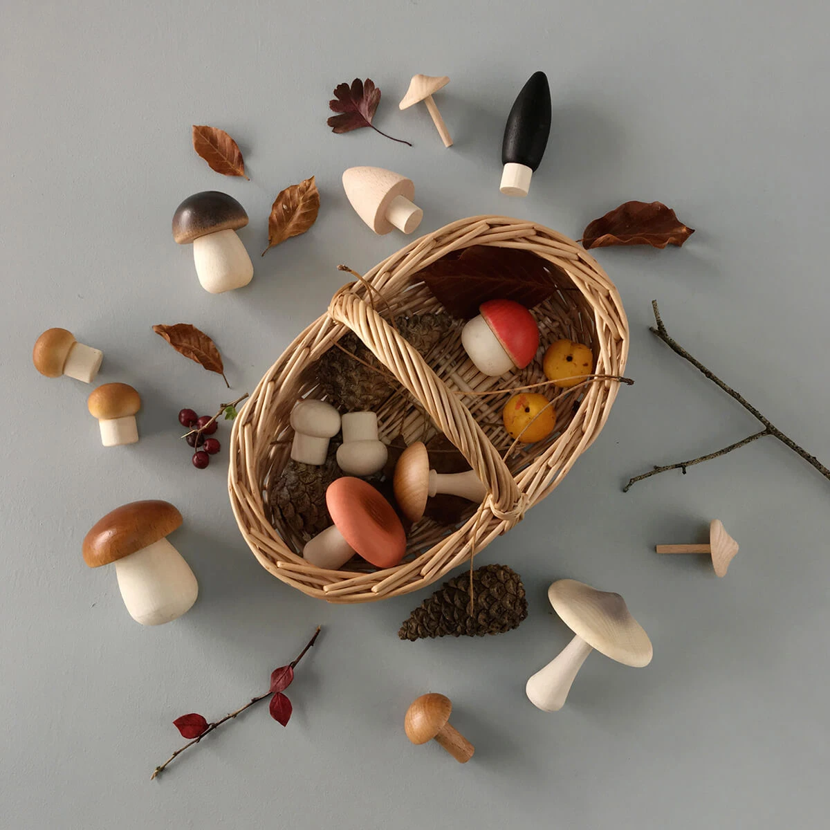 Forest mushrooms basket by Moon Picnic. Beautifully made wooden mushrooms in a cute handmade rattan basket. Gather little mushrooms for your forest friends. Adorable for imaginary play and decoration. Created in a collaboration between Moon Picnic & Erzi. Set includes 15 mushrooms in solid beech wood handmade rattan basket.