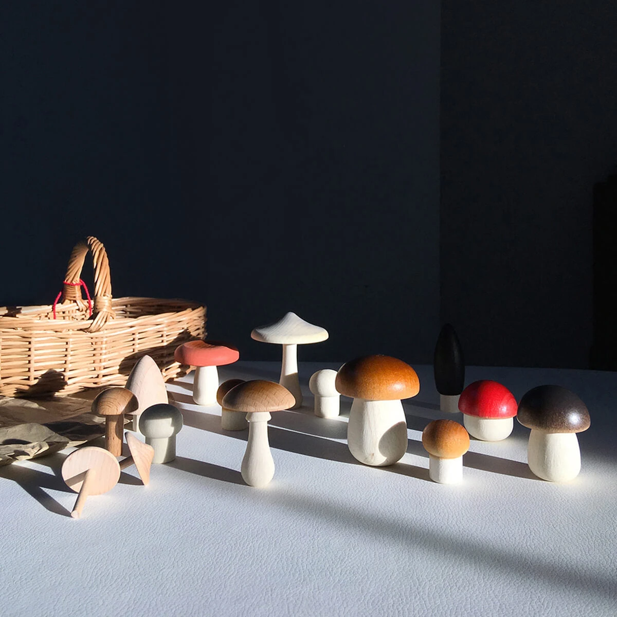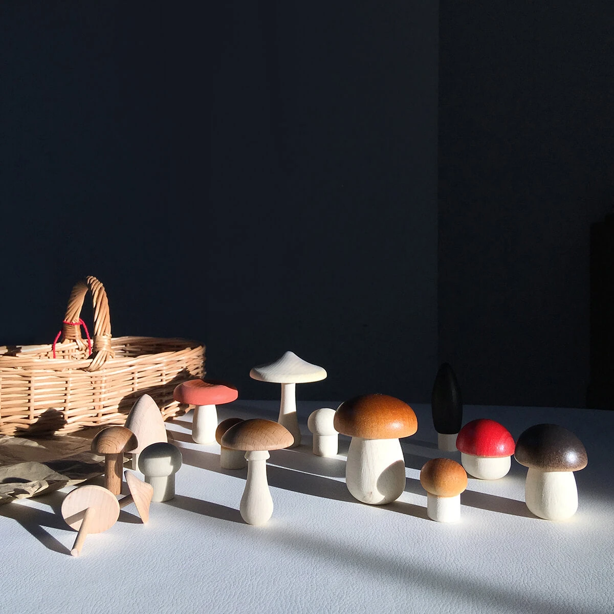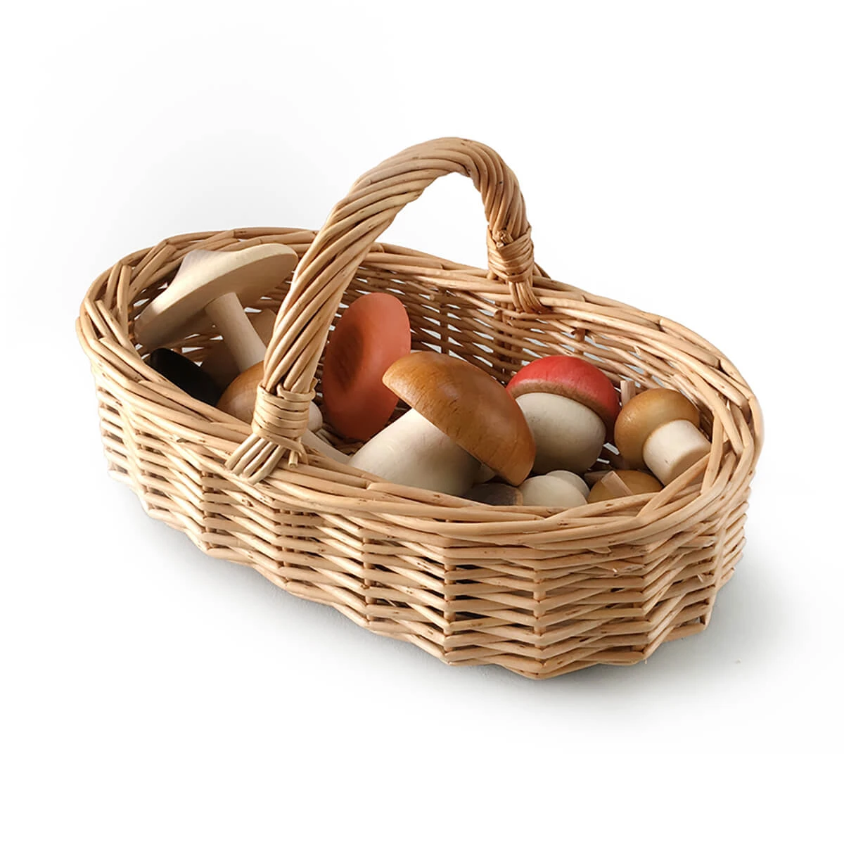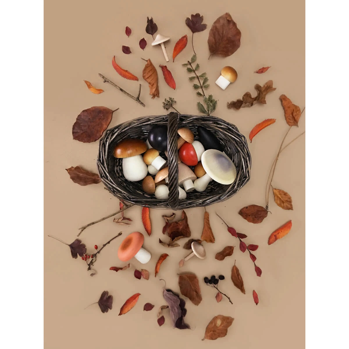 Forest mushrooms basket by Moon Picnic. Beautifully made wooden mushrooms in a cute handmade rattan basket. Gather little mushrooms for your forest friends. Adorable for imaginary play and decoration. Created in a collaboration between Moon Picnic & Erzi. Set includes 15 mushrooms in solid beech wood handmade rattan basket.