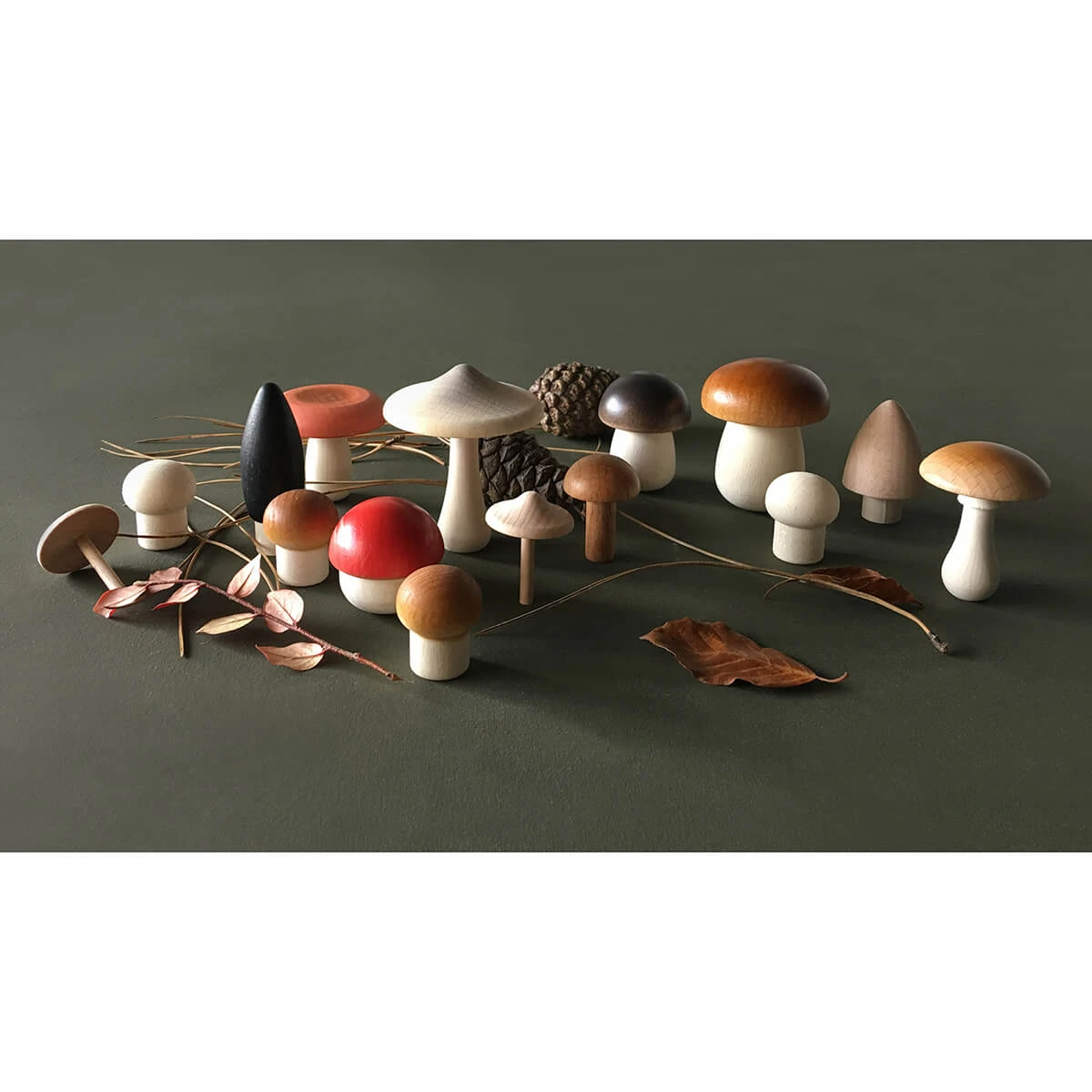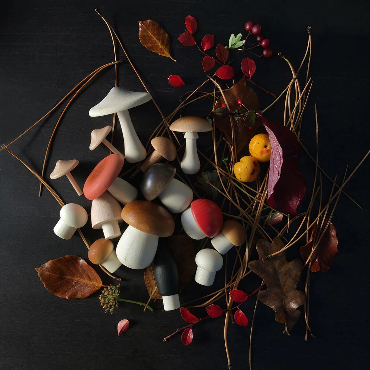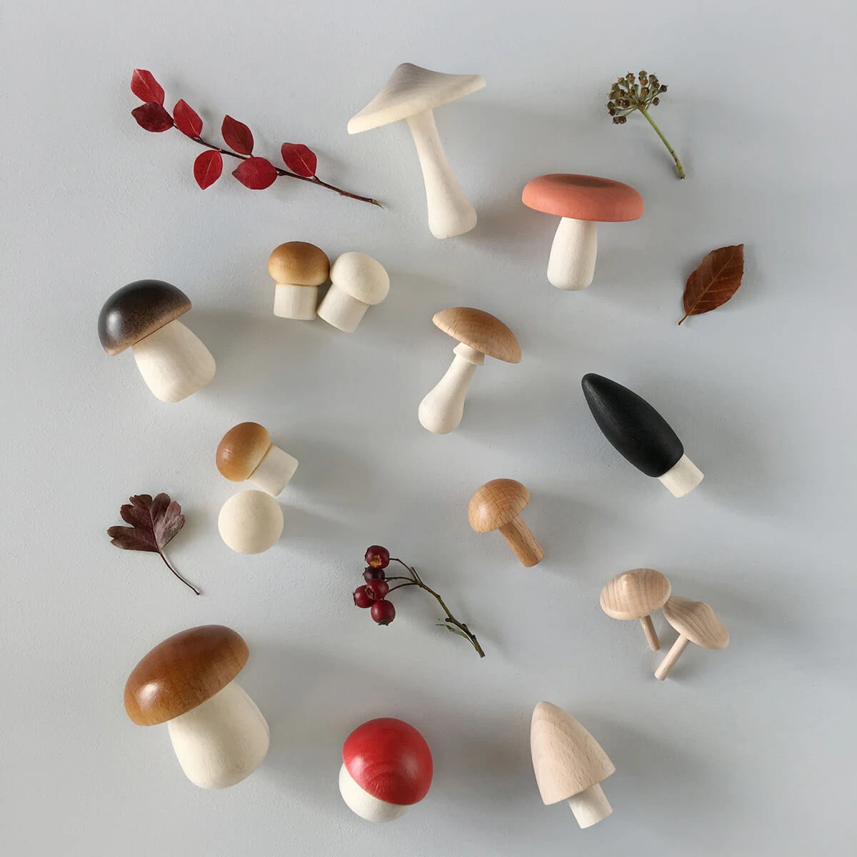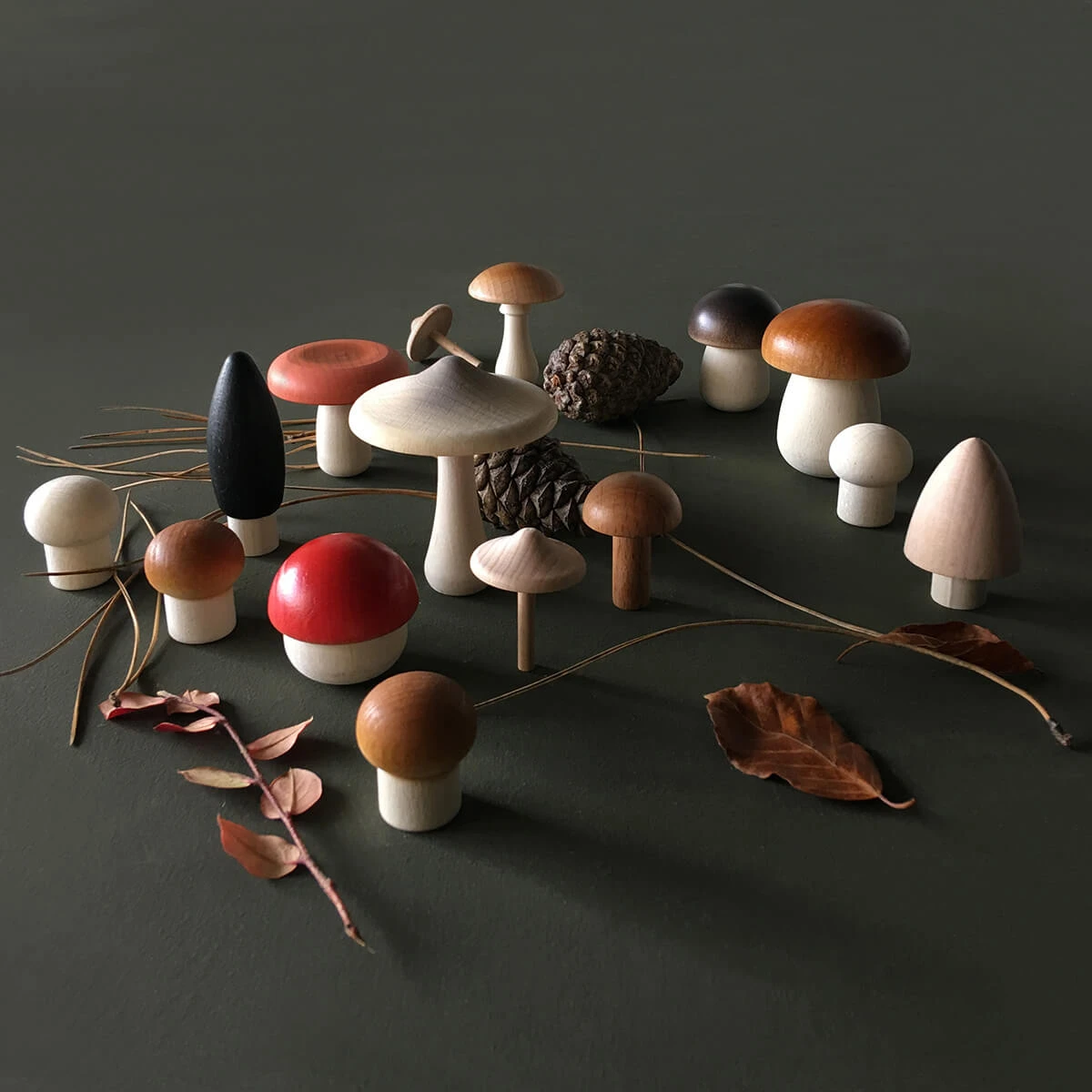 Forest mushrooms basket by Moon Picnic. Beautifully made wooden mushrooms in a cute handmade rattan basket. Gather little mushrooms for your forest friends. Adorable for imaginary play and decoration. Created in a collaboration between Moon Picnic & Erzi. Set includes 15 mushrooms in solid beech wood handmade rattan basket.