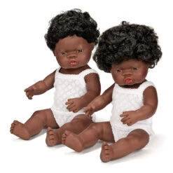 African girl doll by Miniland. Anatomically correct doll dressed in underwear and lightly vanilla scented to smell like a newborn baby. With moveable limbs and head and sewn on hair, the doll is manufactured from non-toxic Phthalates-free vinyl, which makes it soft and flexible to touch, and very resilient. The doll can also be bathed. Comes in an eco-friendly cardboard box.
