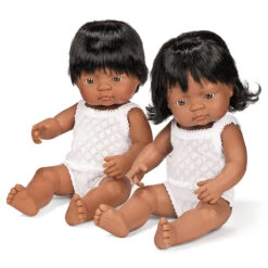 Hispanic girl doll by Miniland. Anatomically correct doll dressed in underwear and lightly vanilla scented to smell like a newborn baby. With moveable limbs and head and sewn on hair, the doll is manufactured from non-toxic Phthalates-free vinyl, which makes it soft and flexible to touch, and very resilient. The doll can also be bathed. Comes in an eco-friendly cardboard box.