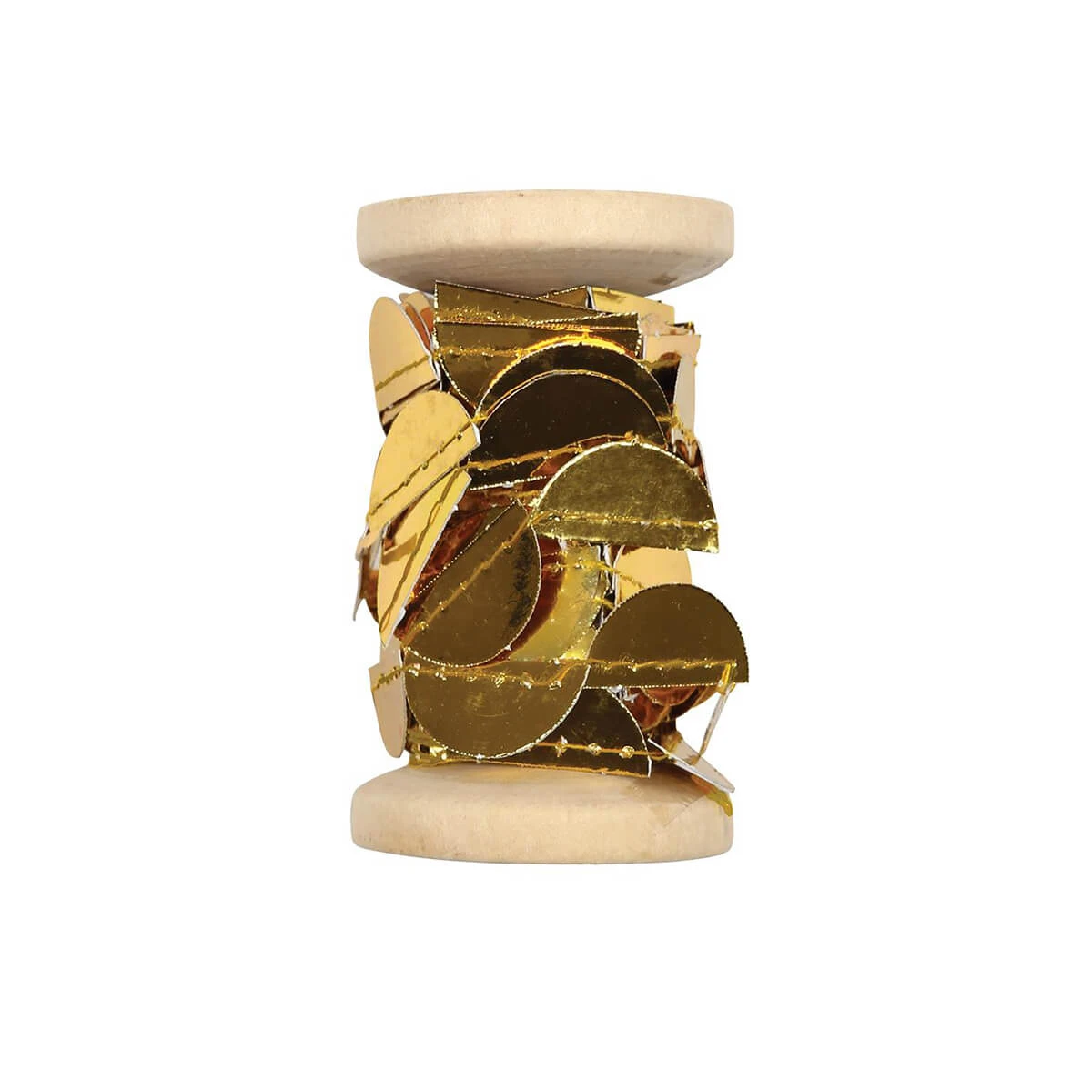 Gold scalloped stitched garland by Meri Meri. A shiny, decorative garland hand stitched and on a wooden spool.  125 foil half circle pennants stitched with approx 4.6m of metallic thread.