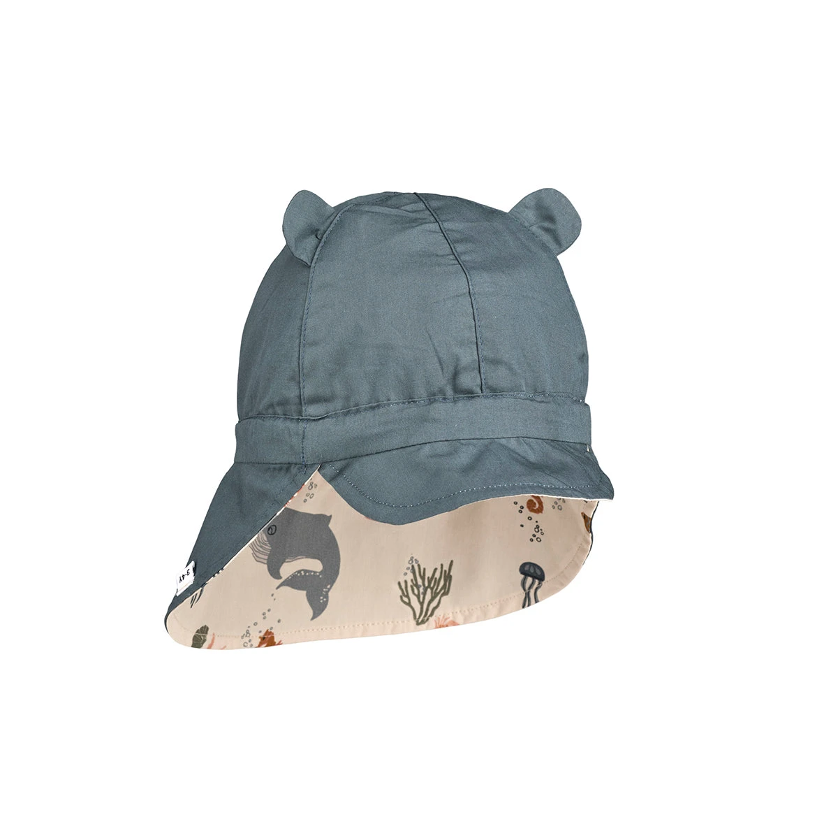 Gorm reversible sun hat by Liewood.  Lightweight, reversible sun hat with a peak at the front and protection at the back for maximum safety in the sun. A drawstring helps secure a perfect fit – colours may vary.