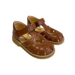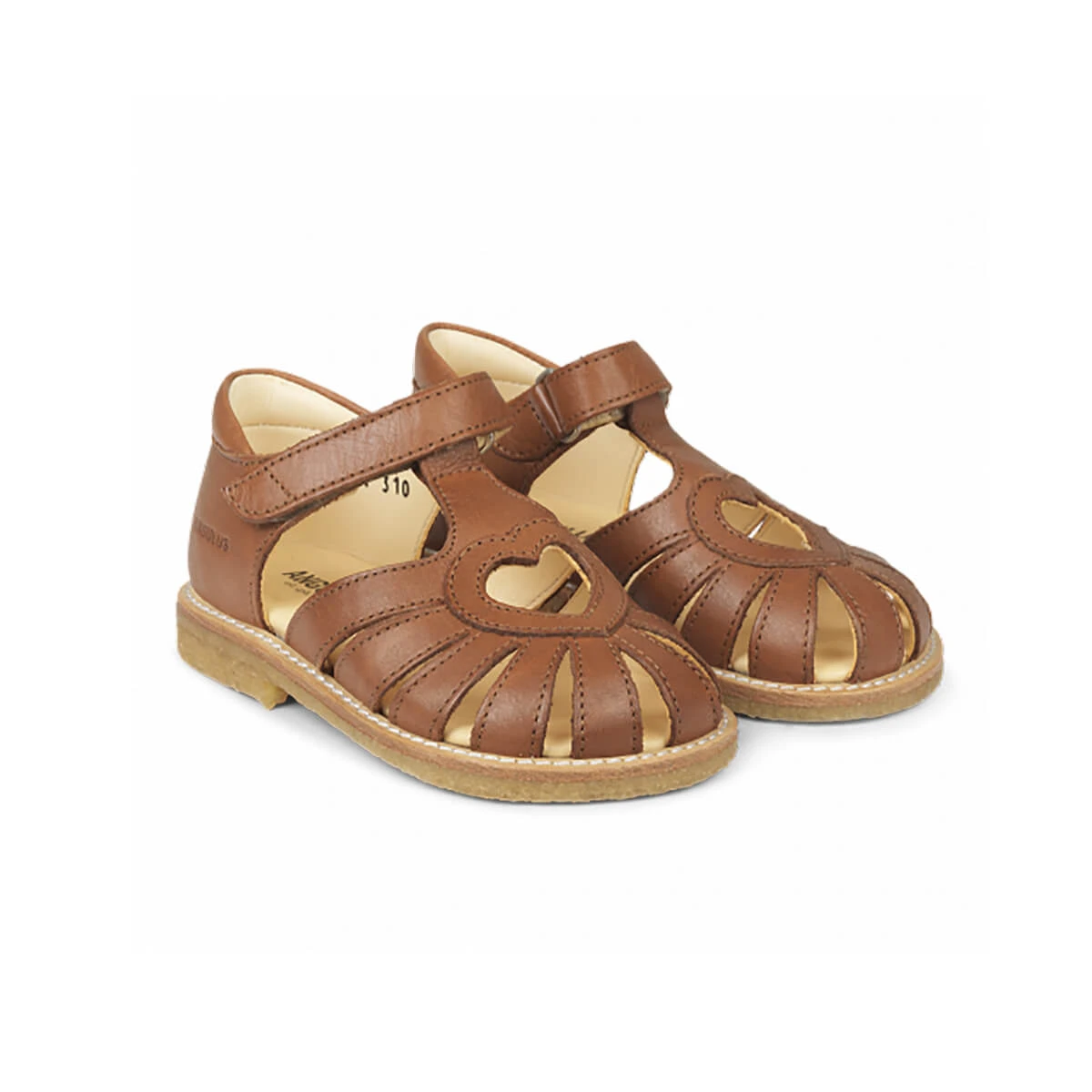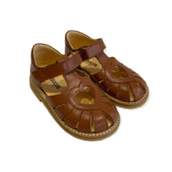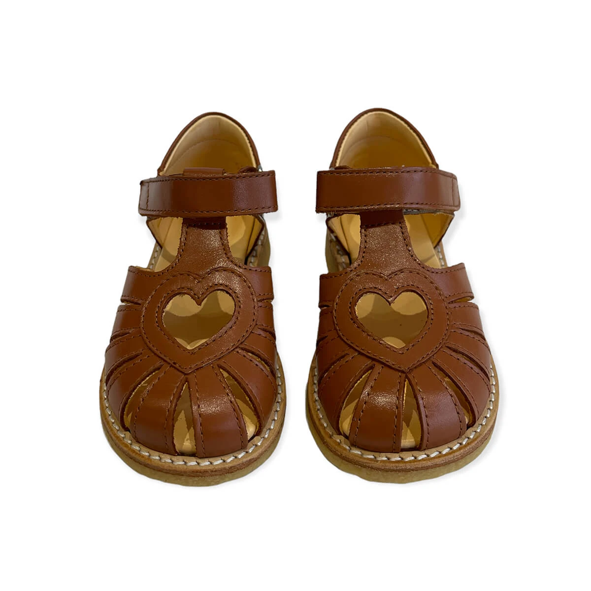 Leather sandals by Angulus. Sandal with cut out heart detail and adjustable velcro strap. Closed toe and solid heel cap for maximum support. Soft and flexible crepe rubber sole. Lined with 100% chrome-free leather.