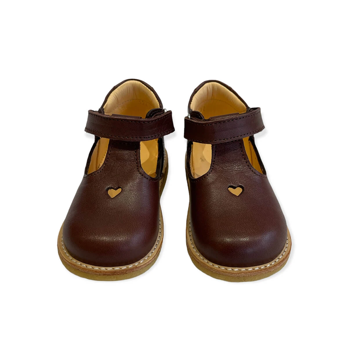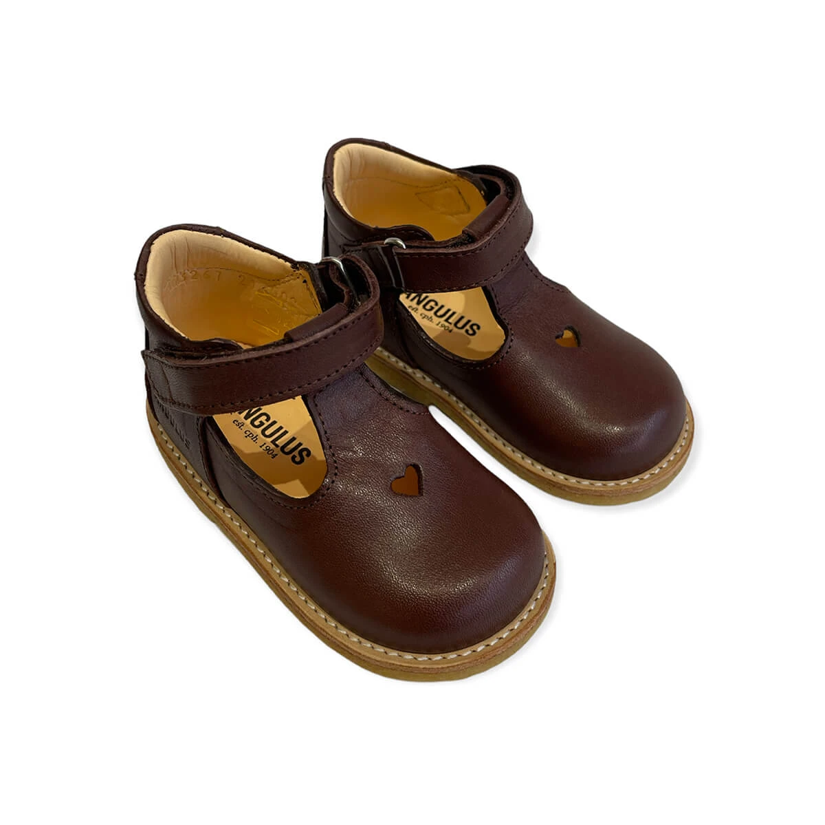 Leather starter shoes with heart cut out detail on the front by Angulus. T bar Mary Jane style shoes with adjustable velcro strap. Closed toe and solid heel cap for maximum support. Soft and flexible crepe rubber sole. Lined with 100% chrome-free leather.