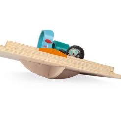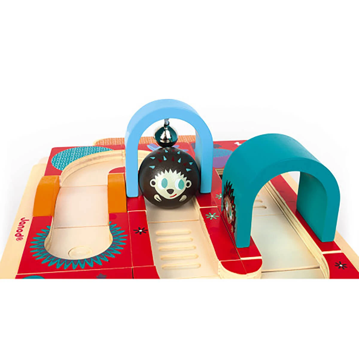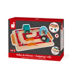 Hedgehog Rally toy by Janod.  A course to put together using a moving game board and 12 double-sided track pieces. As children move the large hedgehog-shaped ball along the track, they develop hand-eye coordination and fine motor skills. The pieces are detachable and may also be used apart from the game board.