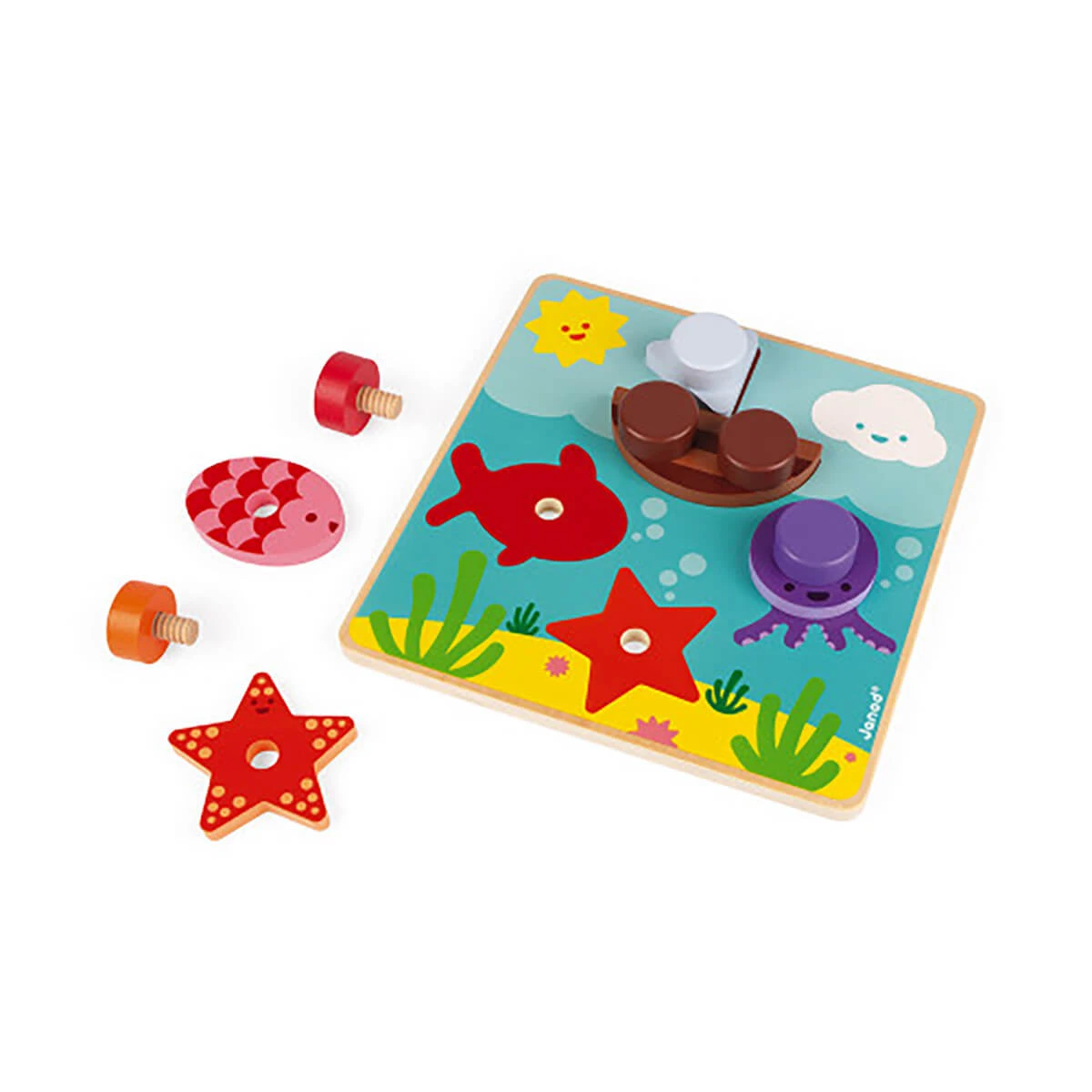 I am learning how to use a screw: aquatic by Janod.  Featuring easy-to-use large wooden screws, this game is comprised of a wooden tray and 11 pieces, develops children’s dexterity and familiarises them with marine animals such as fish, octopus and starfish, as well as geometric shapes (the sail’s triangle, the octopus’ circle, the fish’s oval, etc.). Superimpose the corresponding shape onto the drawing and screw it on to obtain a lovely three-dimensional picture.