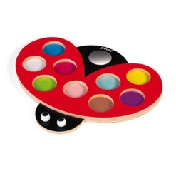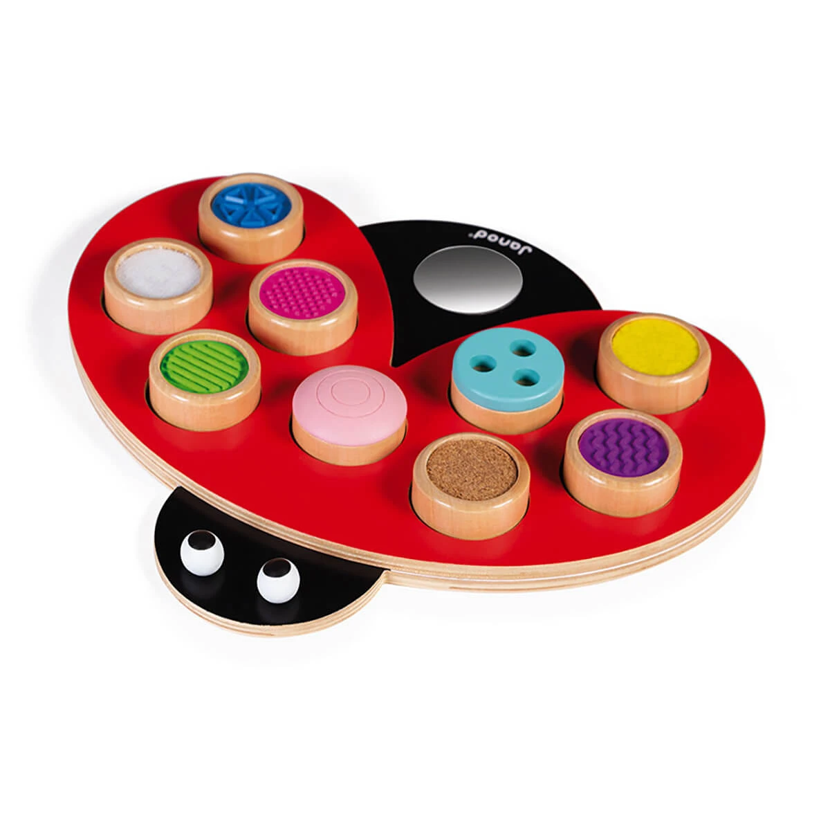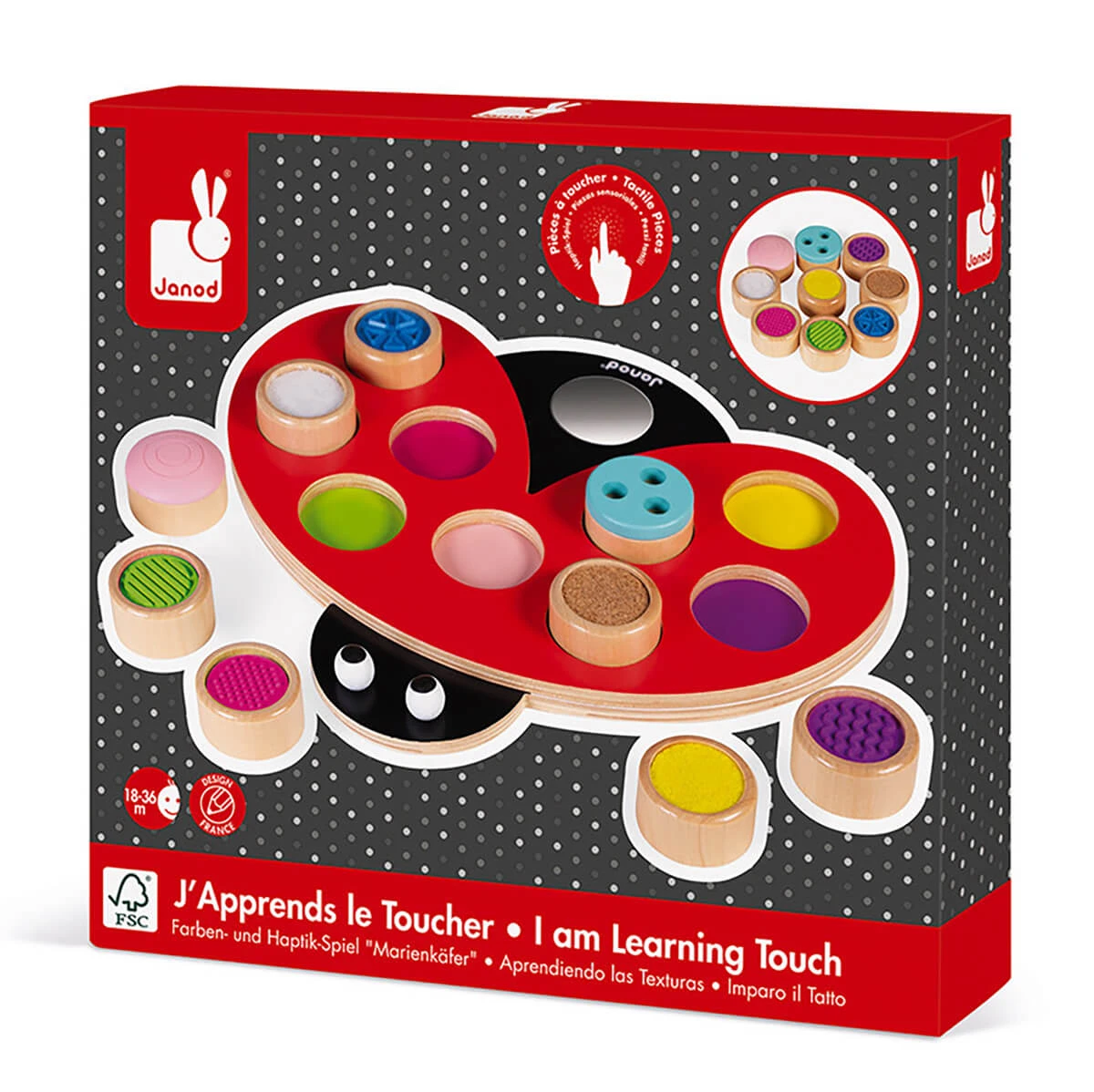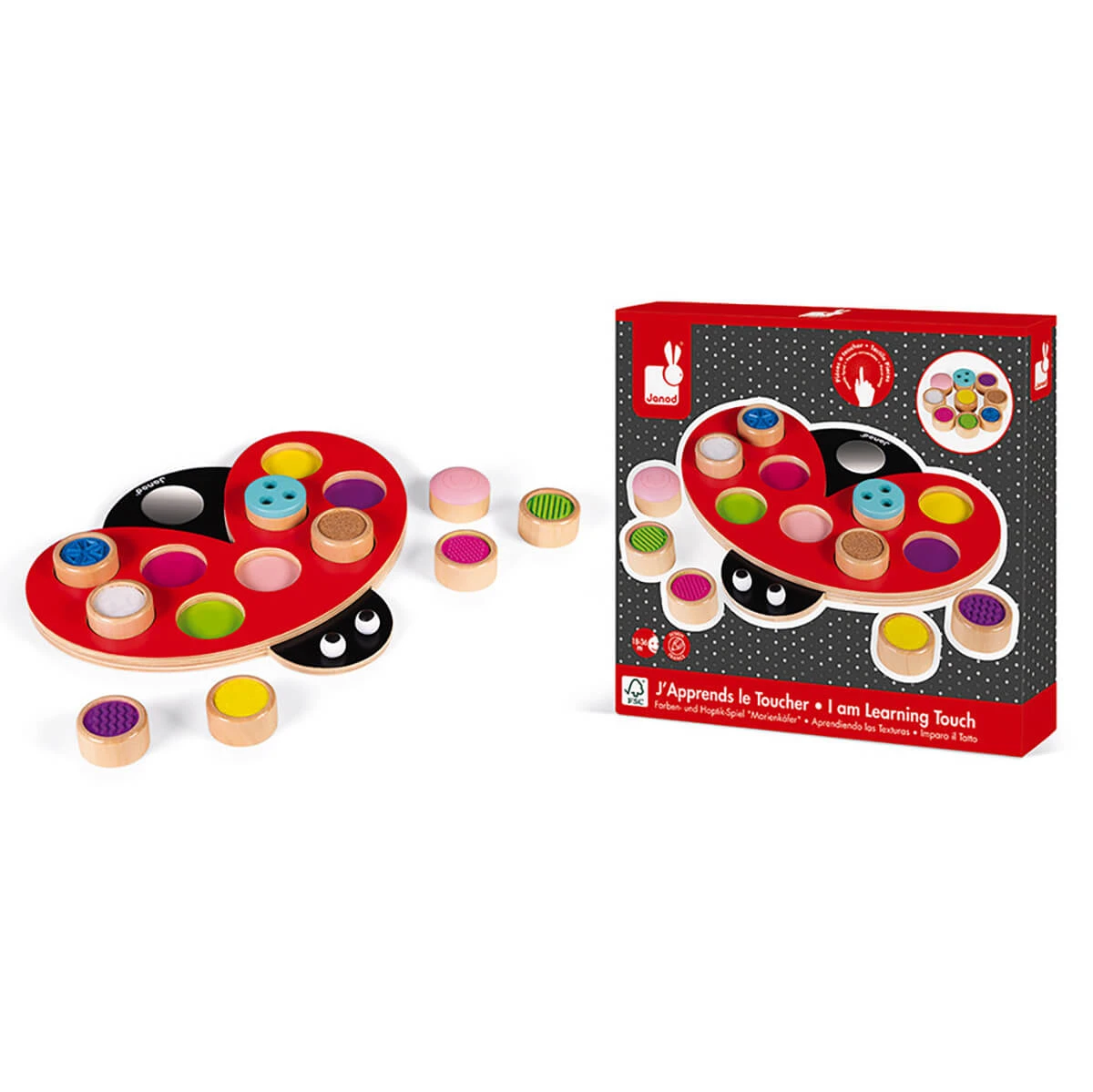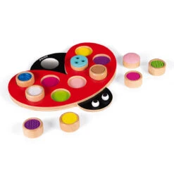 I Am Learning Touch: Coccitouch ladybird sensory toy by Janod.  This little ladybug is ideal for helping your child to develop their sense of touch. The 9 round pieces have different textures (relief, wood etching, cork, felt and velcro) that will provide your child with endless fun. As an added bonus, it can also help little one associate the colours of the round pieces with the spots on the ladybug, and they can also look at themselves in the mirror.