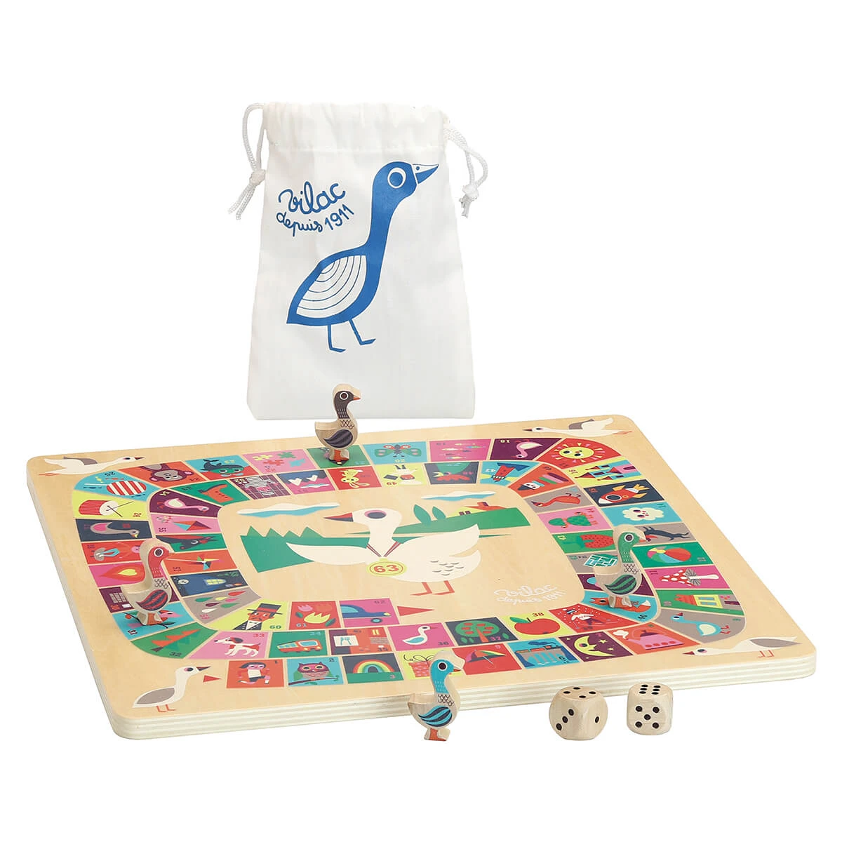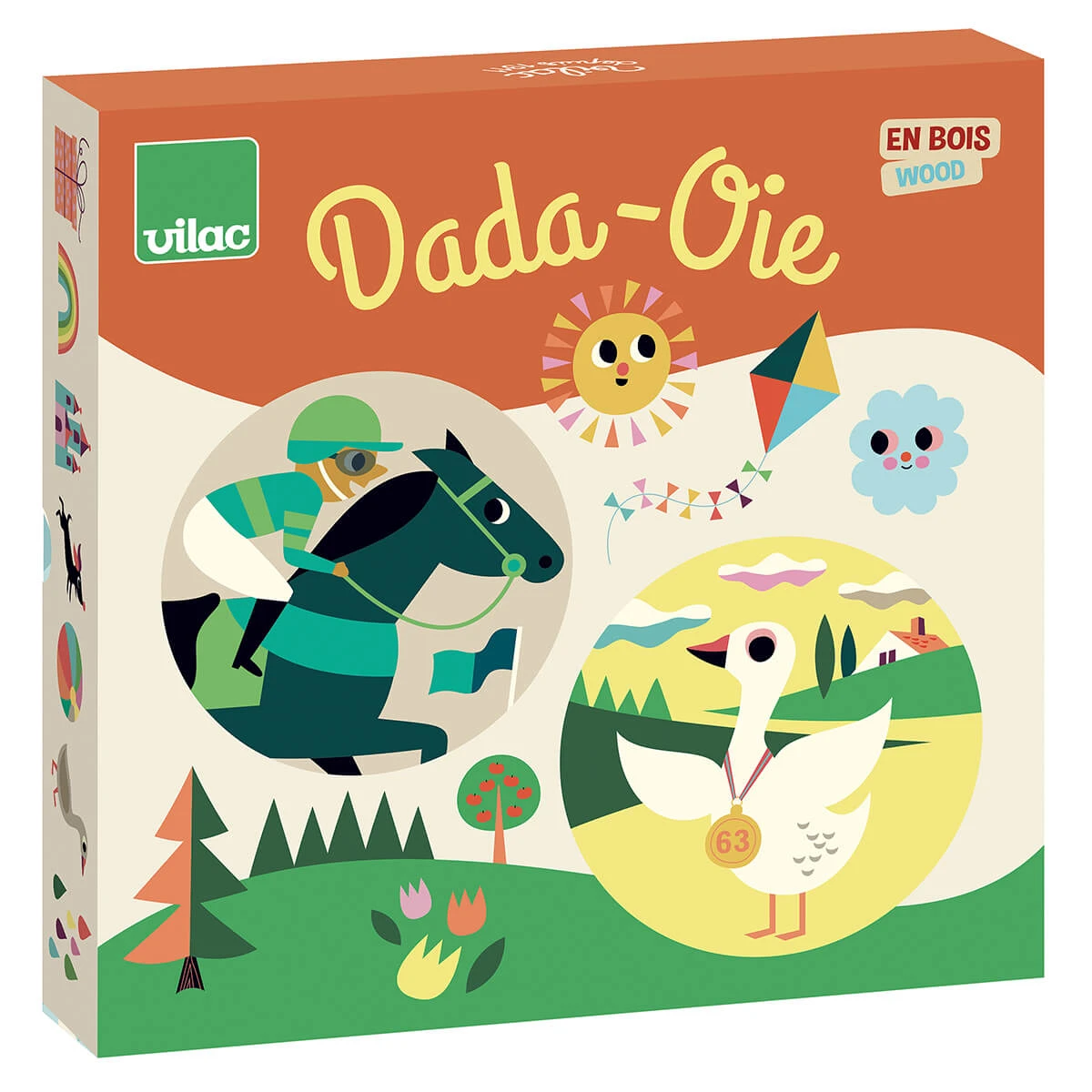 Dada-Oie 2 in 1 board game set by Vilac. Two traditional board games robustly made in wood: Ludo on one side and Goose Game on the other. Beautifully designed by specialist French toymakers Vilac.  Vilac have been producing timeless heirloom toys since 1911.