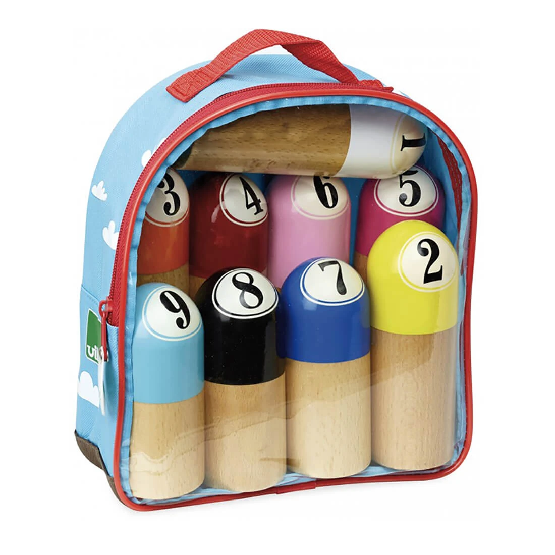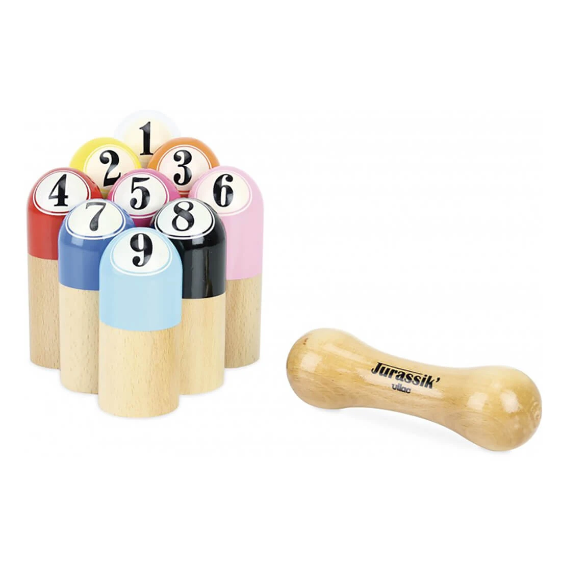 Jurassik 9 skittles game by Vilac. Wooden skittles, beautifully designed by specialist French toymakers Vilac, who have been producing timeless heirloom toys since 1911.
