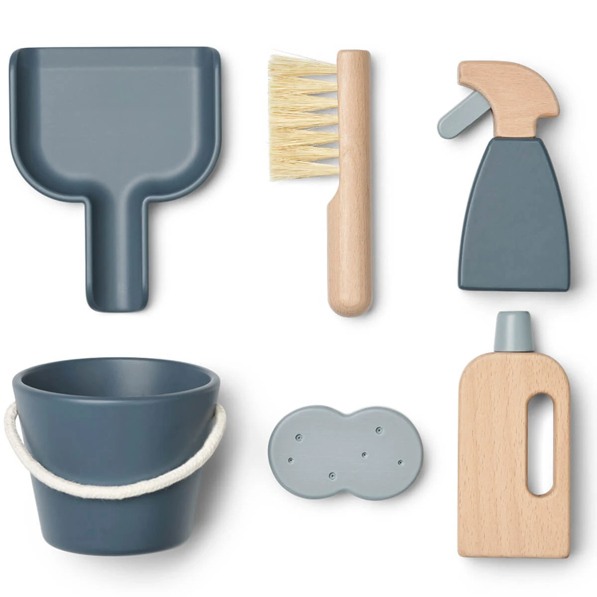 Kimble play cleaner set by Liewood. This high quality pretend play set includes: One handheld vacuum, bucket, bottle, spray bottle, sponge, brush and dustpan. Durable and long-lasting.