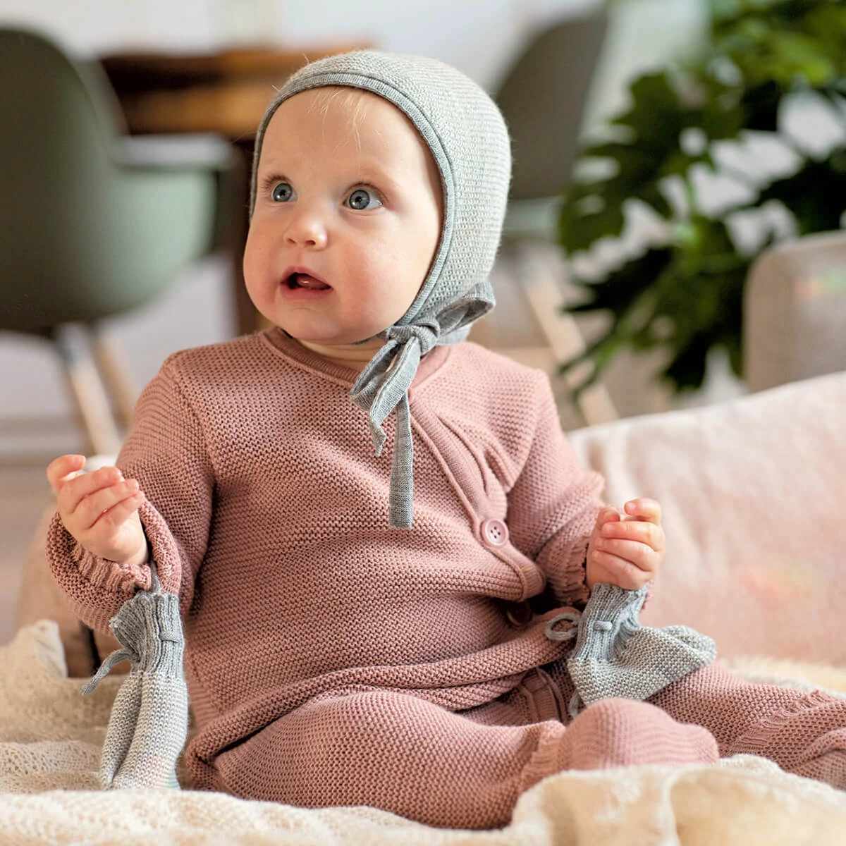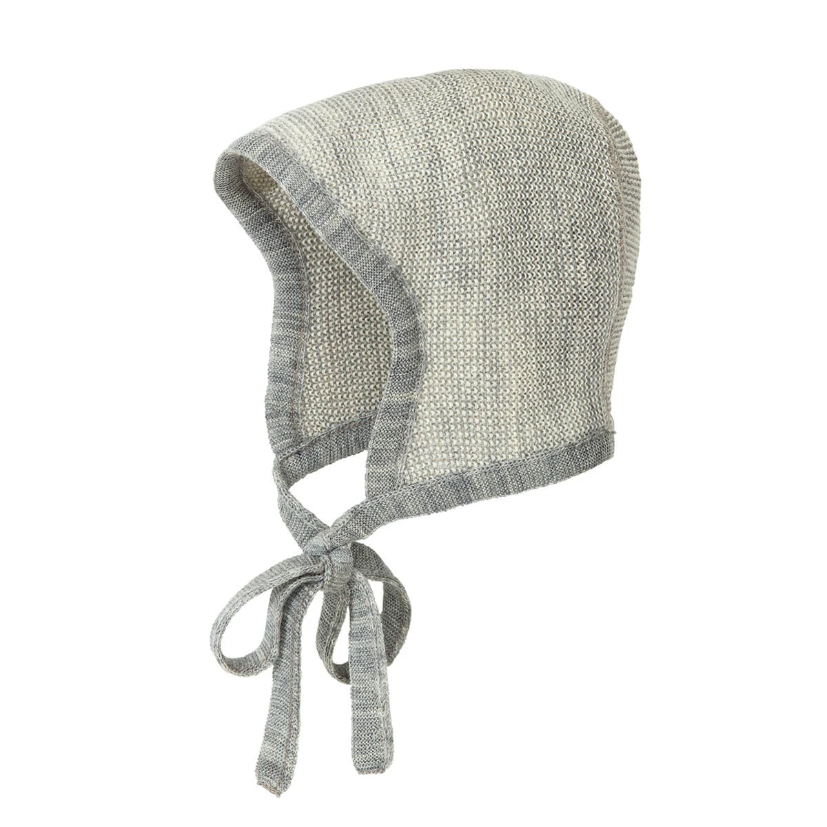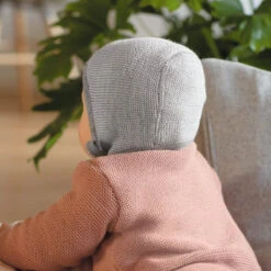 Knitted Merino baby bonnet by Disana.  Knitted merino wool baby bonnet with strings to keep it in place.