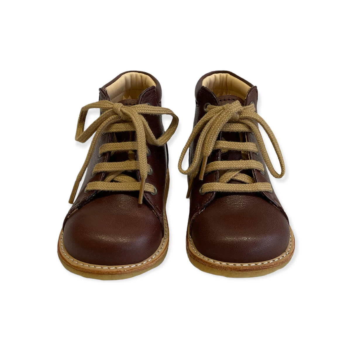 Lace up starter boots by Angulus. Leather lace up boots with stitching detail, ideal as first walkers as they provide very good ankle support, with a soft and flexible crepe rubber sole. Lined with 100% chrome-free leather.