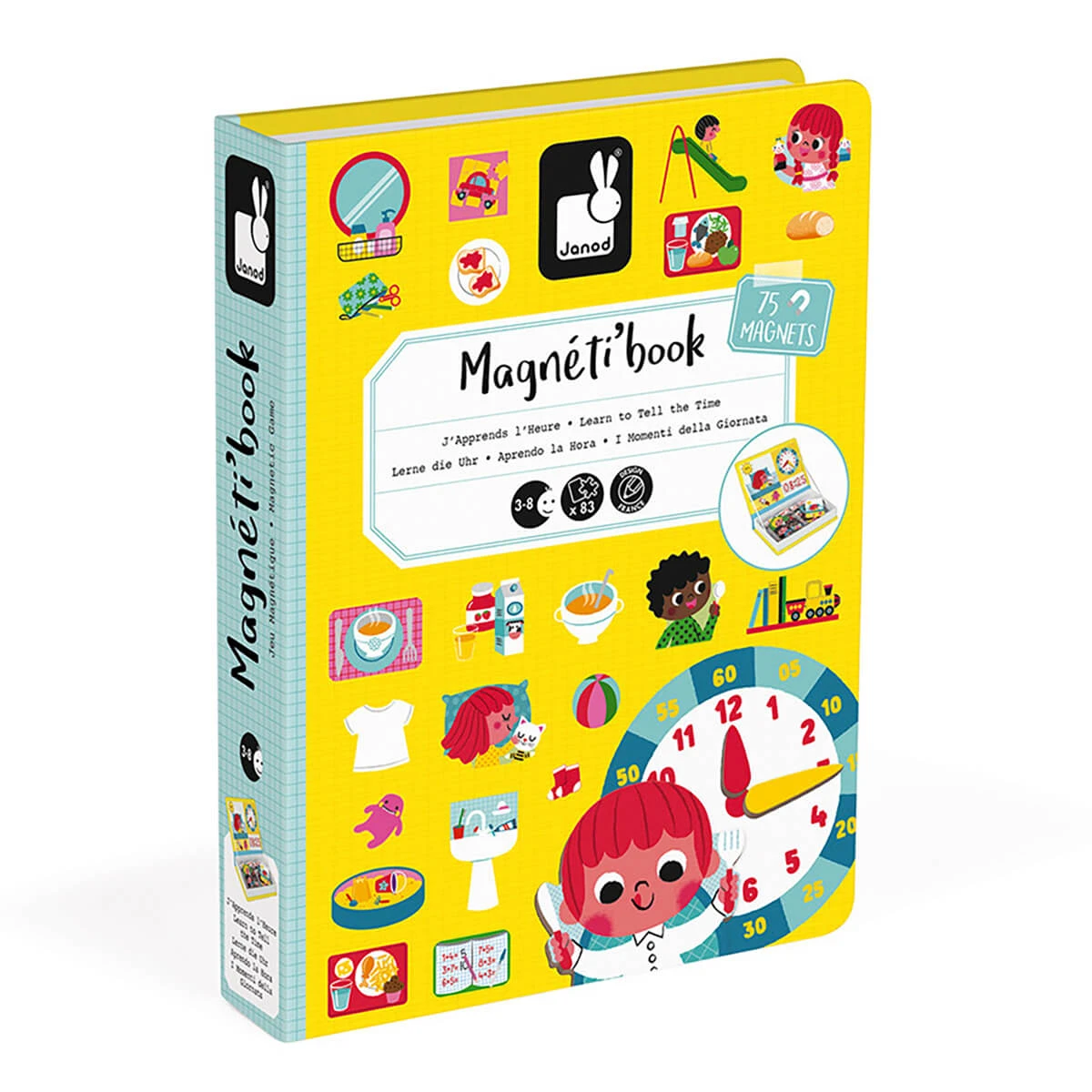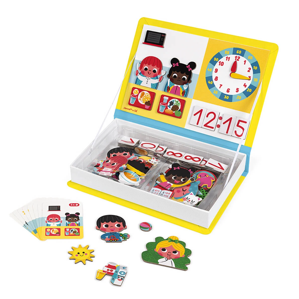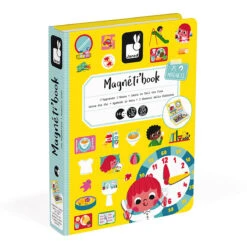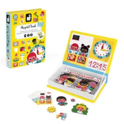 Learn To Tell The Time Magneti Book by Janod. Magnetic educational game in cardboard. Includes 75 illustrated magnets and 16 scenes (8 cards printed on both sides). Once the book is opened, the aim is to make the scene indicated on the card using the magnets.