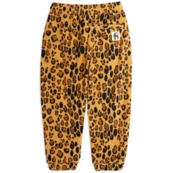 Leopard fleece trousers by Mini Rodini. Leopard fleece trousers made from 100% recycled polyester. The trousers have two side pockets, a fake pocket in the back with a panther label sewn on, as well as soft cuffs by the ankles and an elastic drawstring waist. These trousers can be used all year round, worn separately or under a pair of shell trousers.