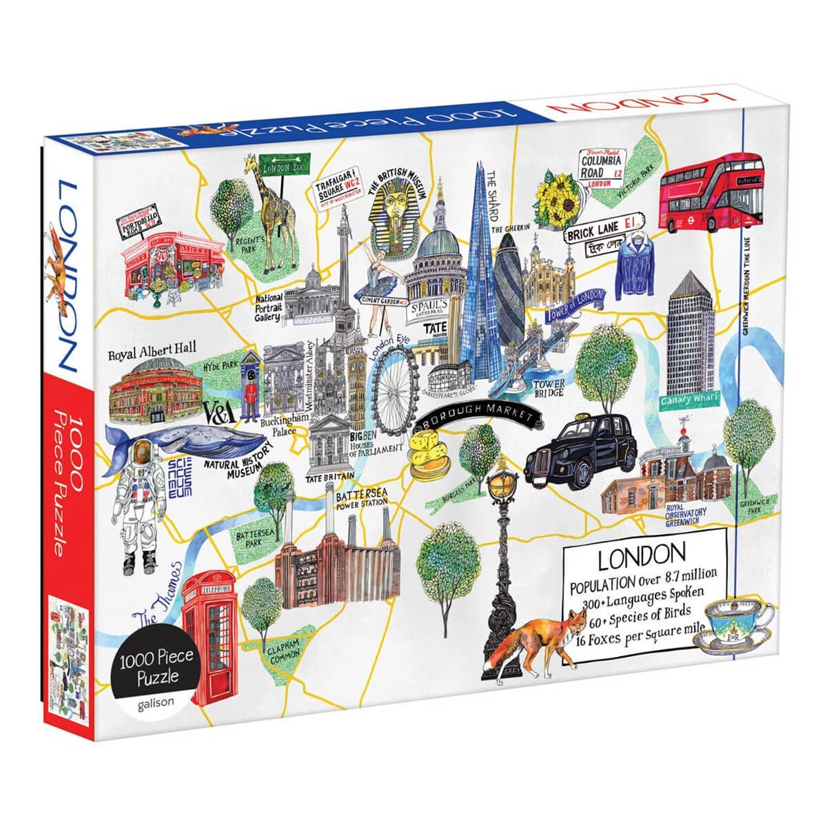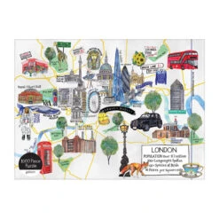 Get to know London by working this illustrated map of city featuring the city’s most famous sites and landmarks including Buckingham Palace, Trafalgar Square, Royal Albert Hall and many more. Galison’s London Map 1000 Piece Puzzle is packaged in stylish matte-finish sturdy box, perfect for gifting, reuse, and storage.