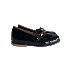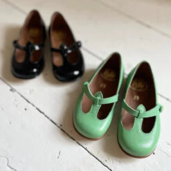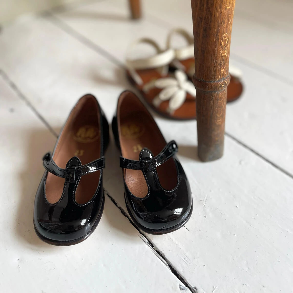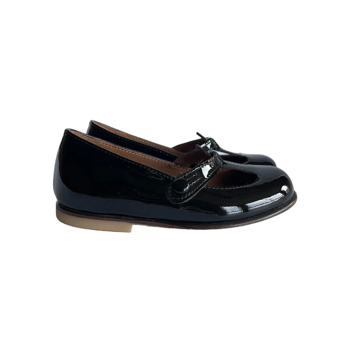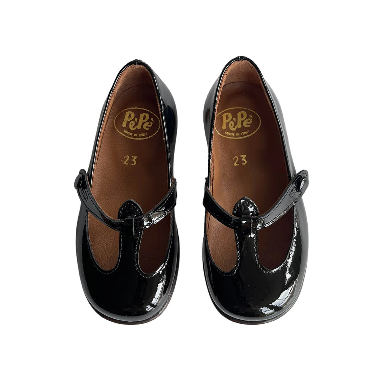 Lulu T bar by PèPè shoes. Button T bar shoes in black patent leather with low T bar detail. Soft and flexible leather sole. Lined with 100% leather. Handmade using traditional methods in Italy.
