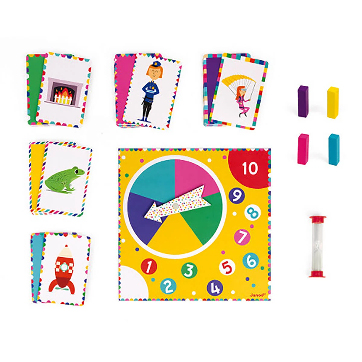 Master Mime game by janod. Jobs, objects, characters and more (5 themes – 24 cards per theme)… The first team to guess 10 words wins! The objective of the game is to use sounds and miming to make others guess the illustration on the card. This party game not only guarantees giggles, but also develops team spirit and creativity.