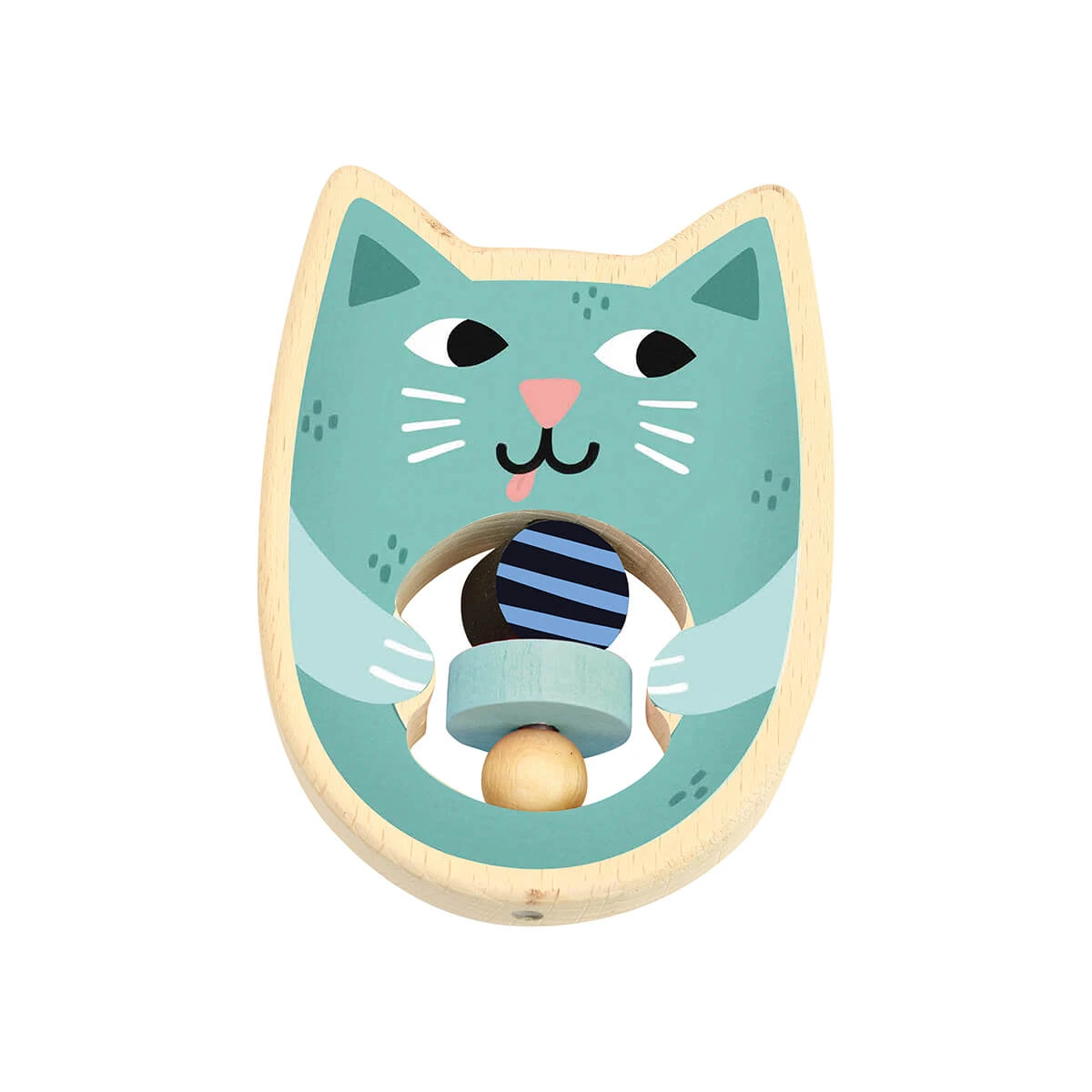Michelle Carslund cat rattle by Vilac. A little wooden toy with rattling beads. Comes with a screen printed cotton bag for storage. Features illustrations by Michelle Carlslund. Beautifully designed by specialist French toymakers Vilac and produced in the Vilac workshop in the Jura Mountains in France. Vilac have been producing timeless heirloom toys since 1911.