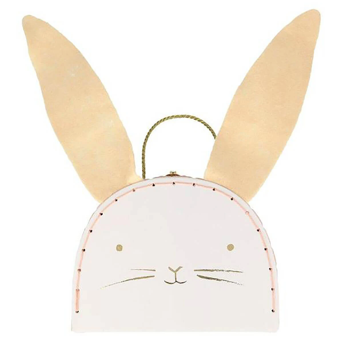 Mini Bunny doll and suitcase by Meri Meri. Looking for a gift, perfect for Easter or any time of the year? Little people will love to open the beautifully designed bunny suitcase to reveal an adorable little bunny doll, crafted from cotton and wearing a sweet gingham dress. She comes with a striped tote bag and felt carrots. A fabulous gift to take on adventures for play at any time.
