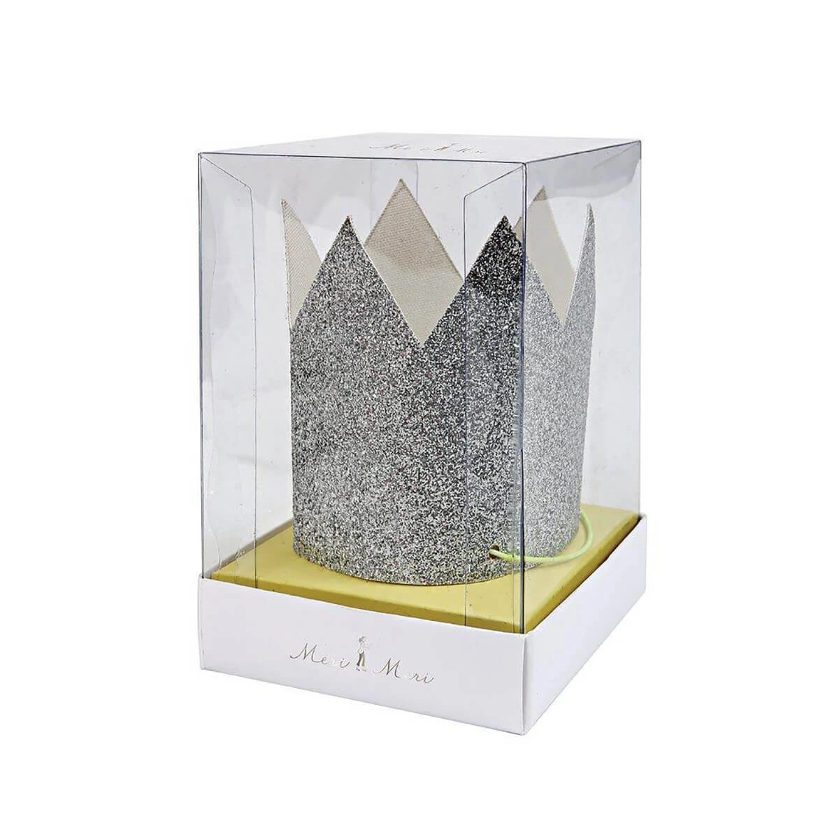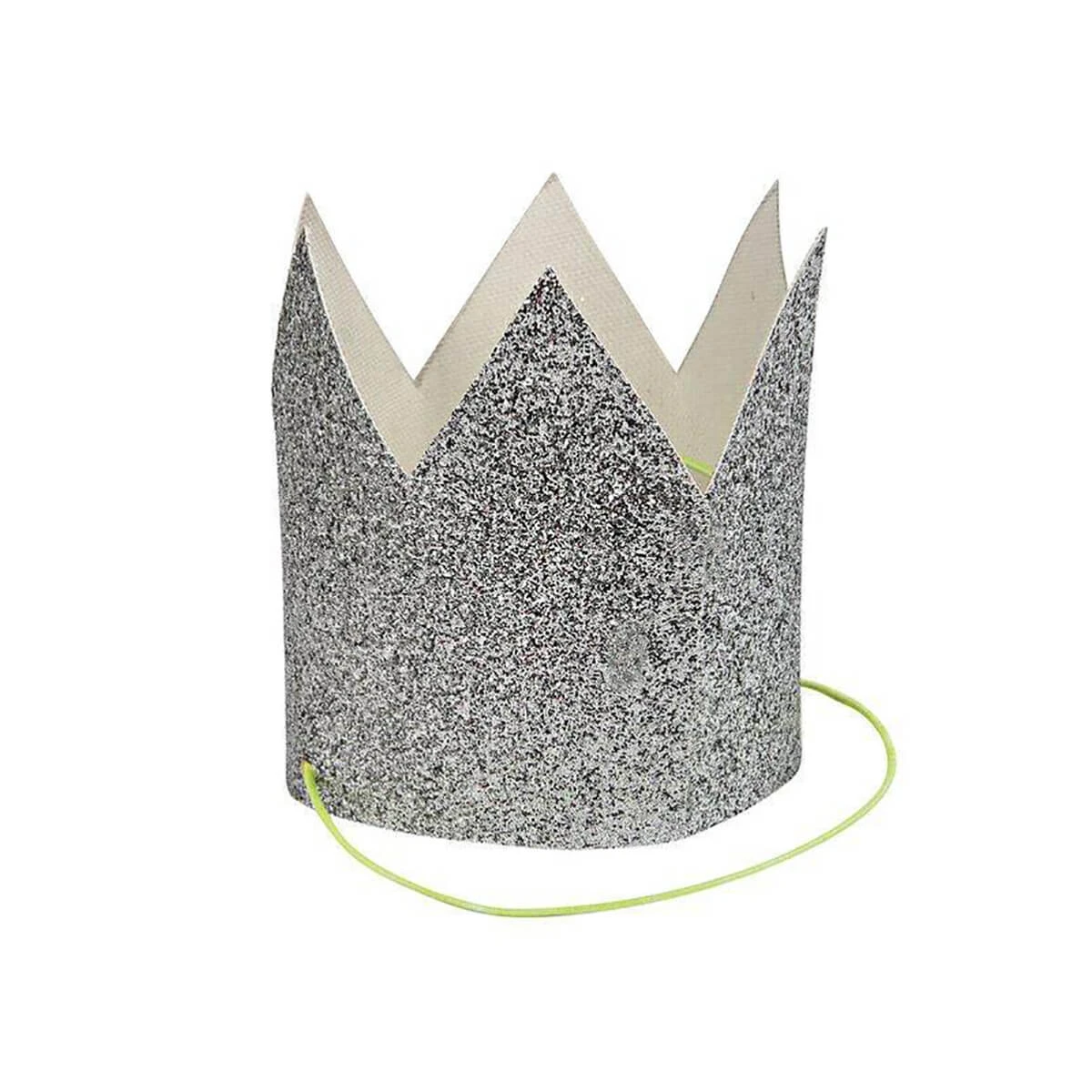 Mini silver glitter crowns by Meri Meri.  These fun party crowns will add a golden shimmer to any celebration. Each crown is crafted using gold glitter fabric and finished with a neon coral tie.  Pack contains 8 party crowns.